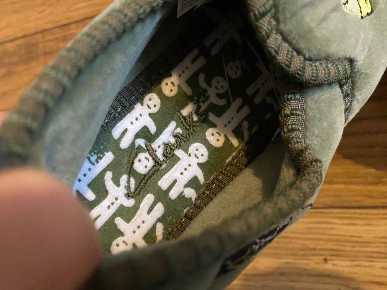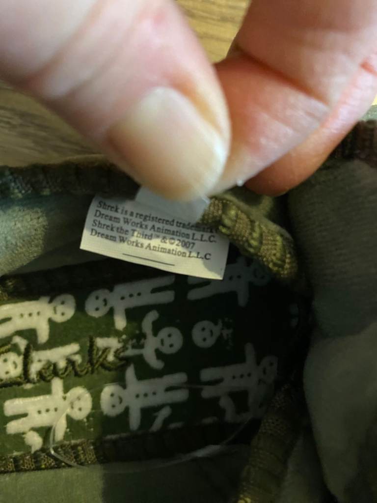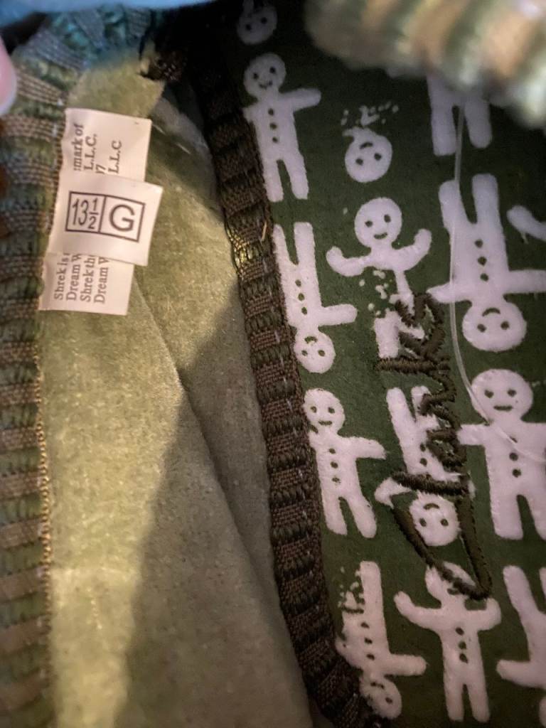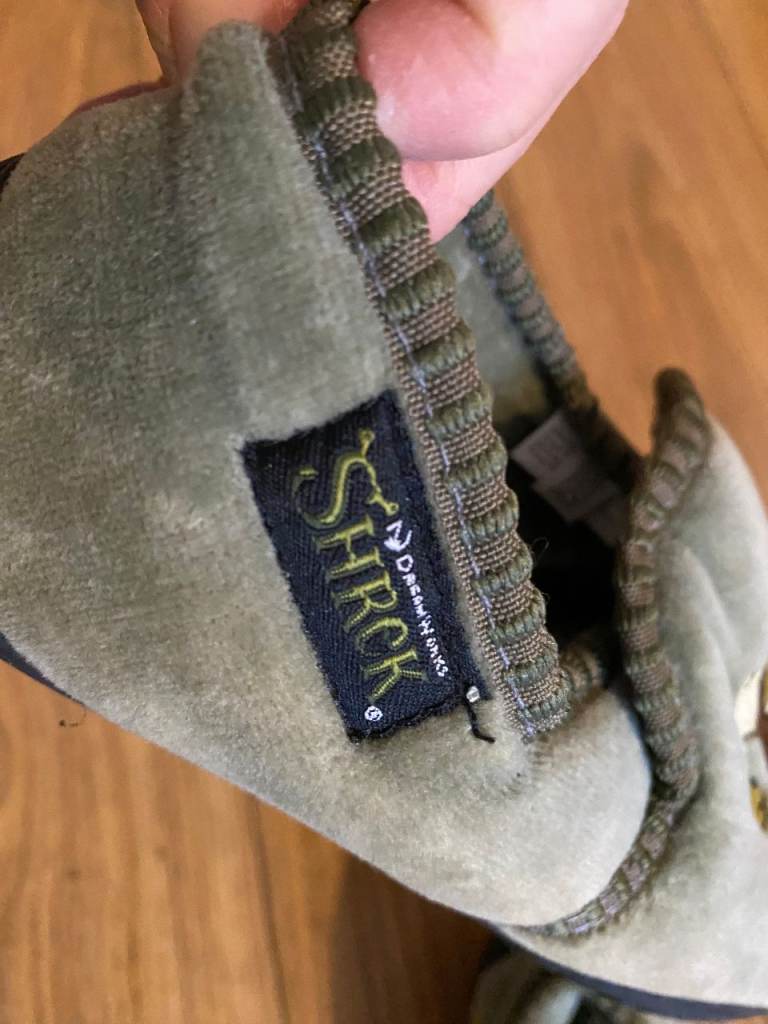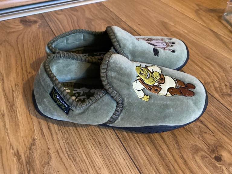 EACH SLIPPER HAS AN APPLIQUÉD & EMBROIDERED DESIGN - ONE IS SHREK, THE OTHER IS THE DONKEY & PUSS IN BOOTS. GINGERBREAD DESIGN TO INSIDE.
