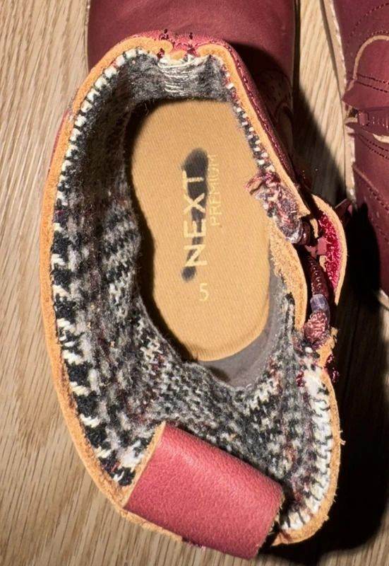 pair of next kids boots in maroon with side zip, buckle strap and brogue‑style detailing. patterned inner lining and rubber soles. size marked 5 on insole.