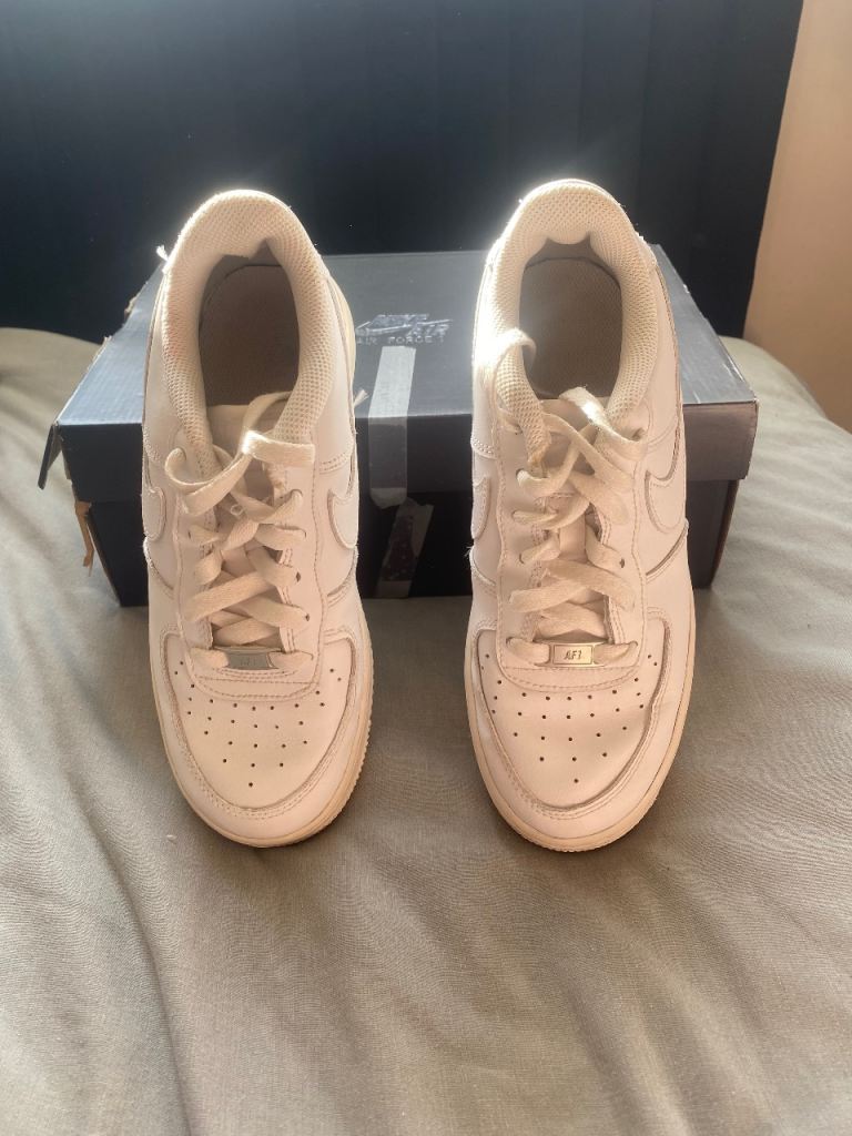 Pair of white Nike Air Force 1 trainers, size UK 5.5.