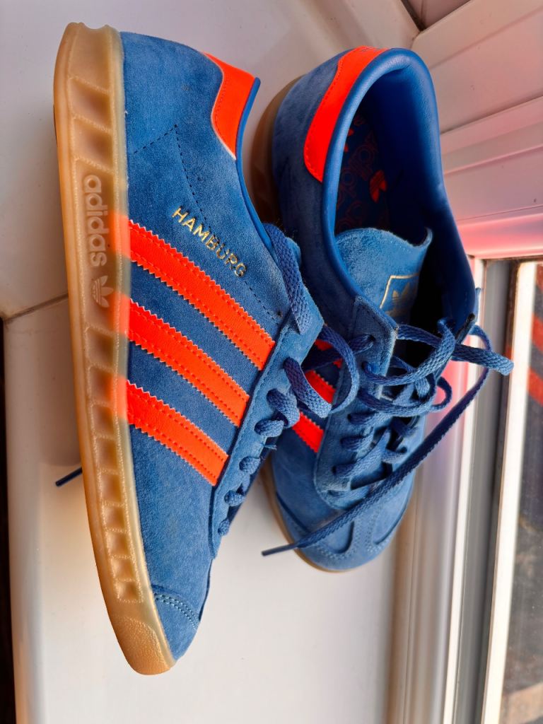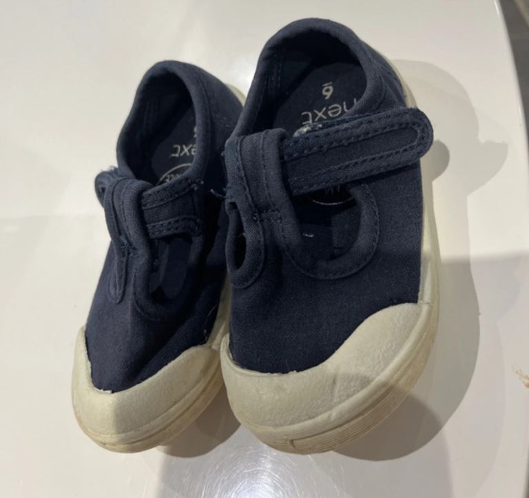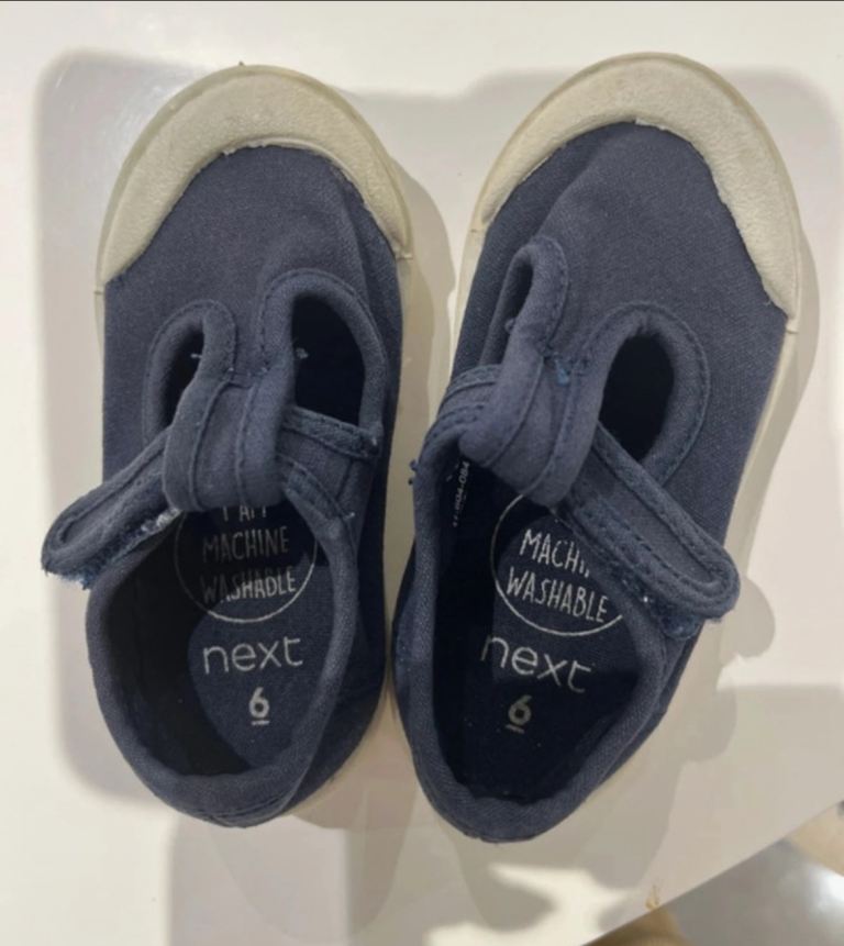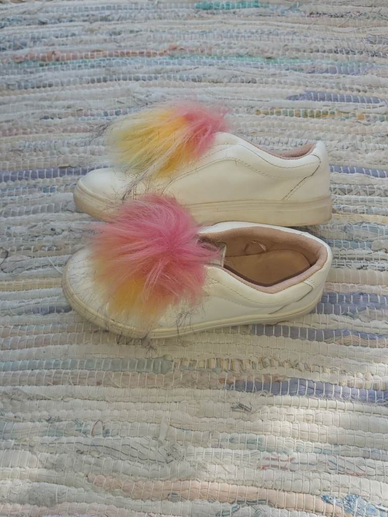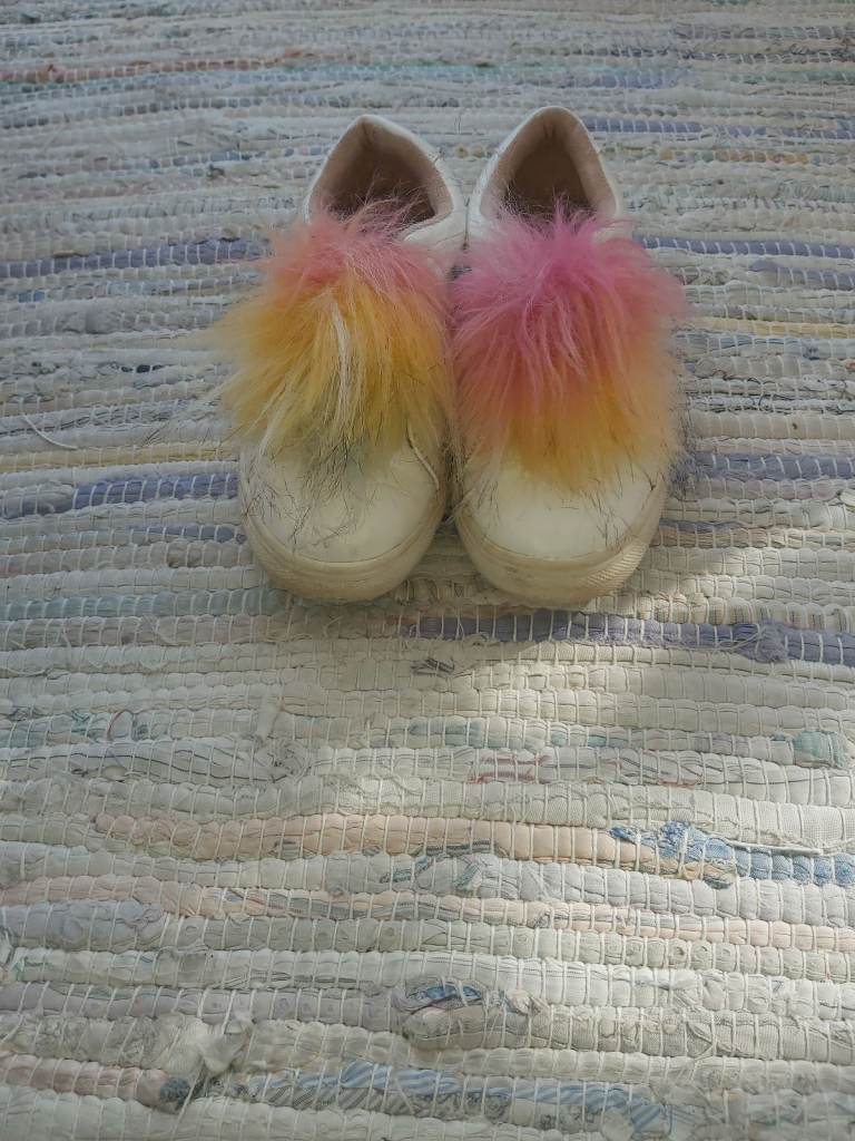The trainers are from Next. Ombre Fluffy Pom Pom topped slip on trainers. White with multi coloured pom poms. Excellent condition.