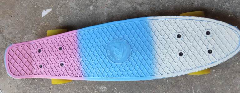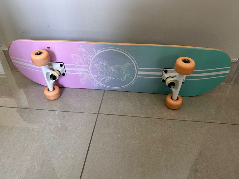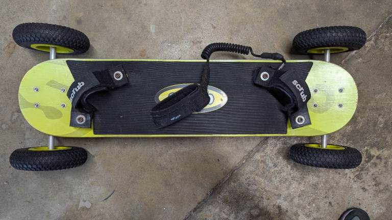 Scrub Lion Canyon mountain board in excellent condition. An entry level board suitable for kiting and downhill. Ideal for juniors and small adults. Measures 90cm x 20cm. The deck is made of ply with rubber grip. It has skate-style trucks, pneumatic tyres, Velcro adjustable bindings (50cm apart) and a safety leash.