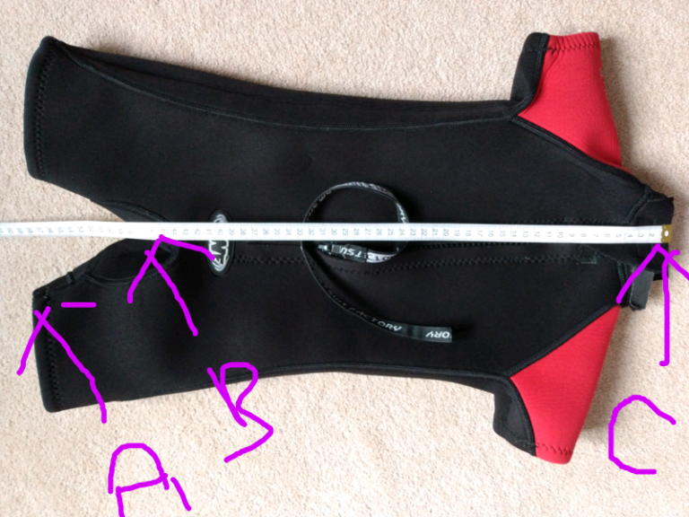 Short wetsuit for a child around age 4-6 depending on height of child. Length shown in photo A-C is 55cm and B-C is 45cm. There is no helpful sizing inside the wetsuit.