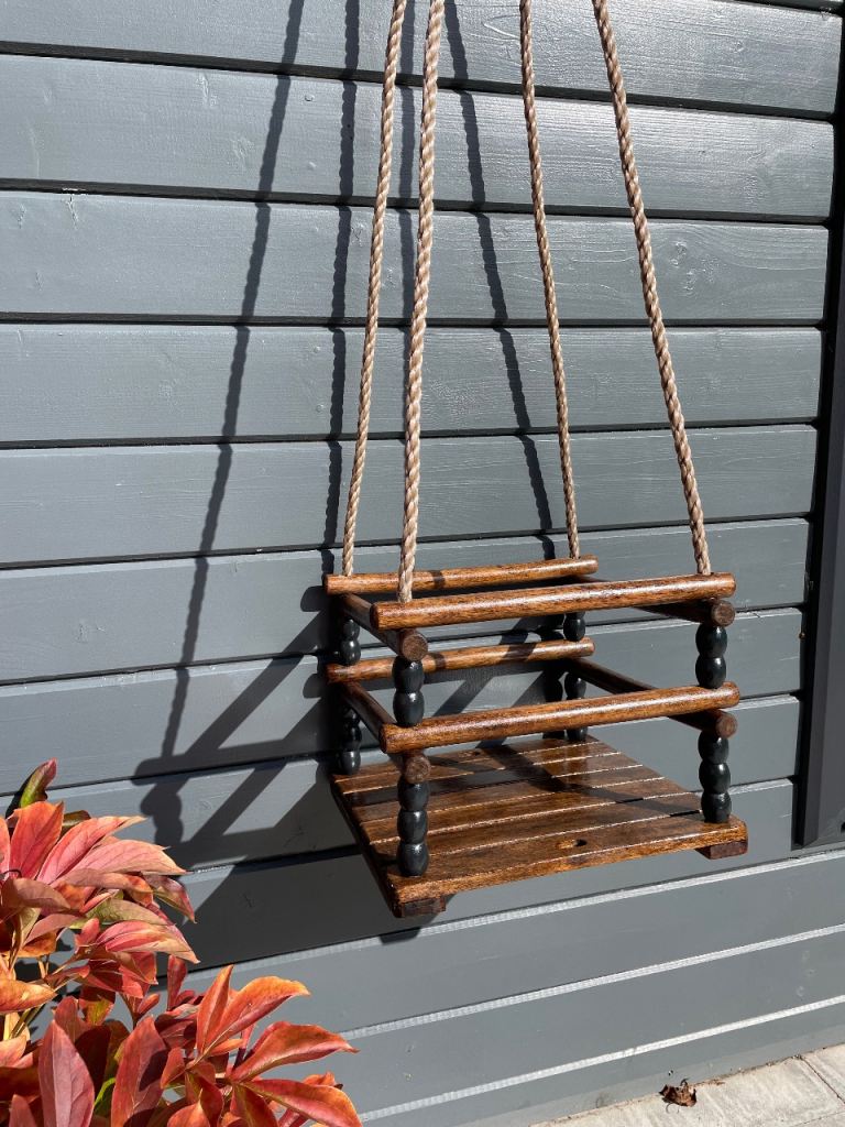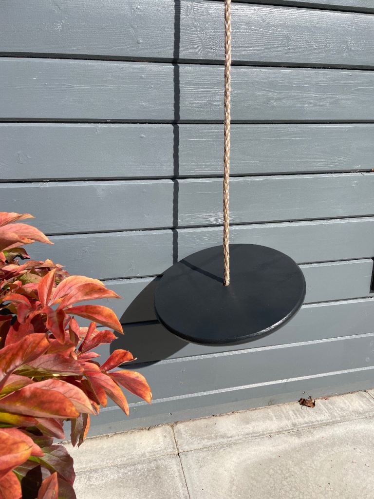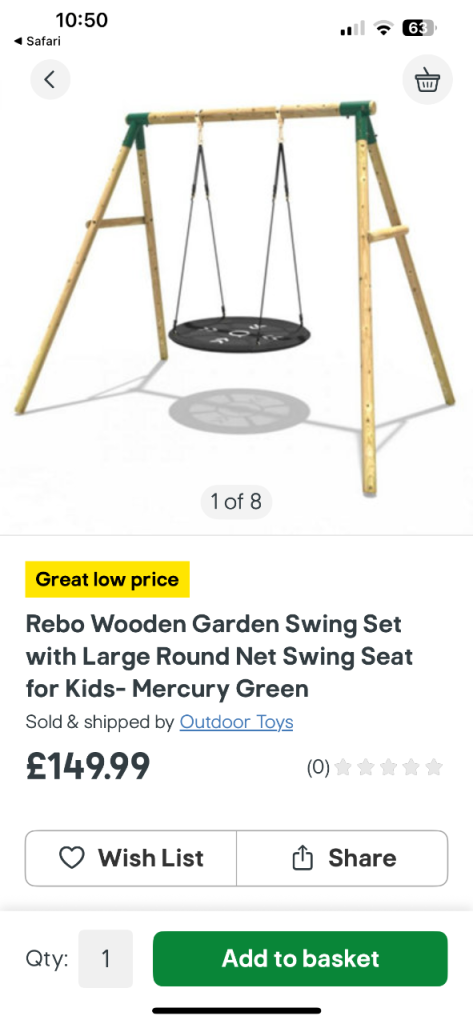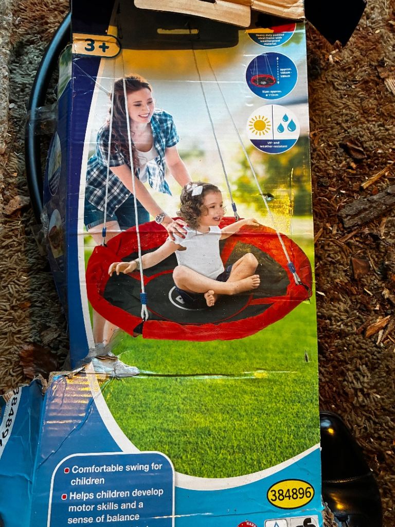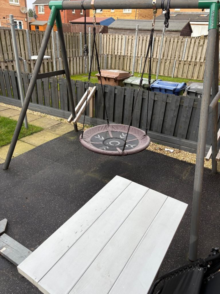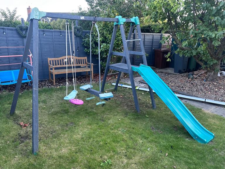 Children climbing frame with slide and 3 swings, one being a see saw, one normal swing and one round swing.