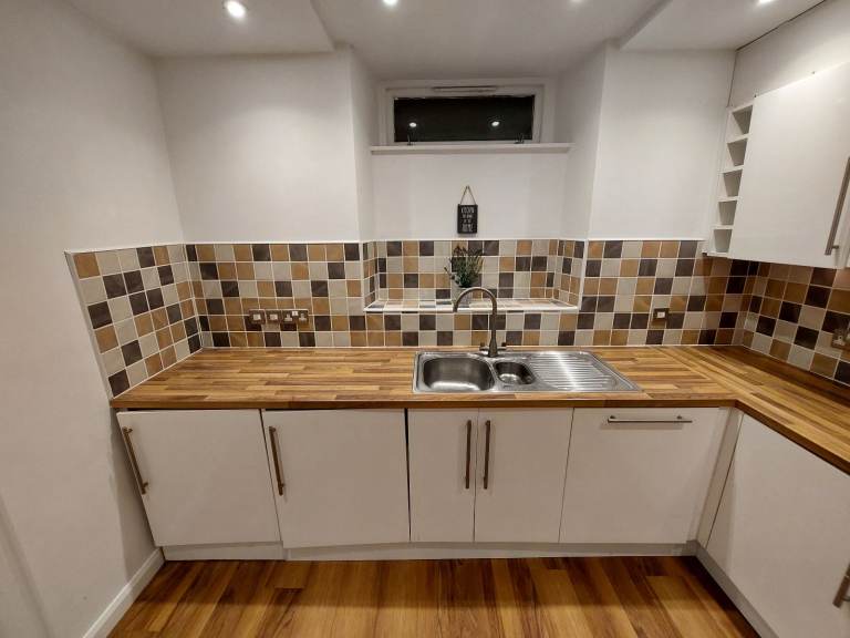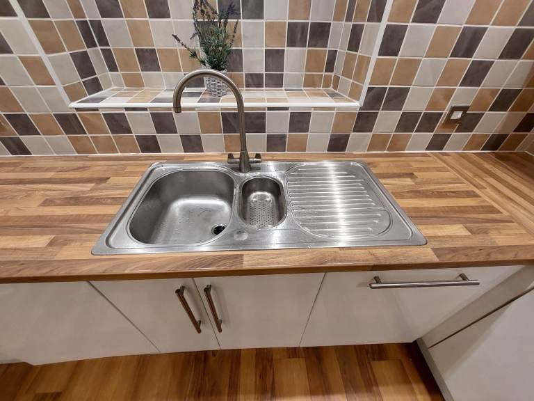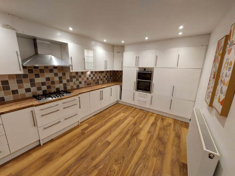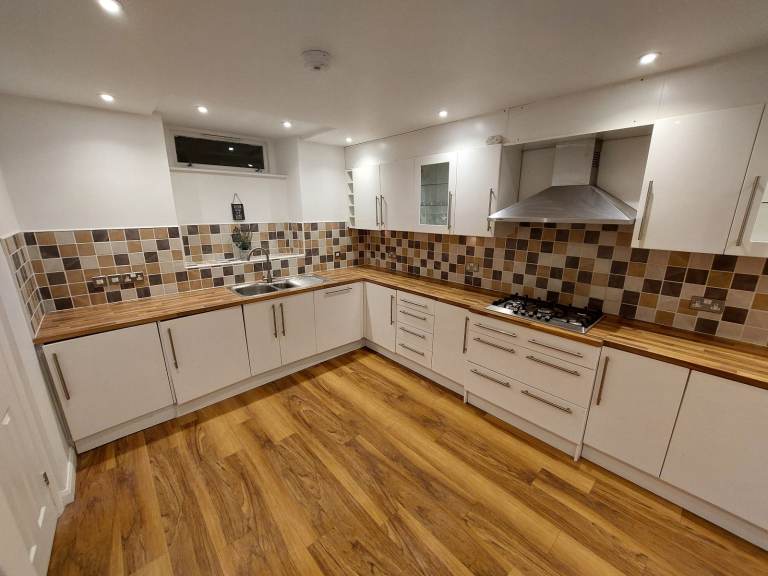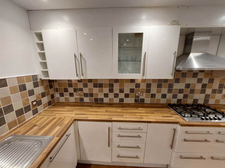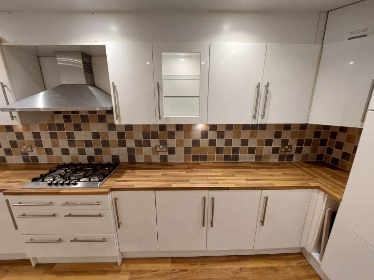 This full U-shaped kitchen includes 29 fitted units all in great condition with under-cupboard and in-cupboard lighting. Lots of storage space with a great combination of half and full height cupboards, drawers and display cabinets. Laminate wood work surface in very good condition.