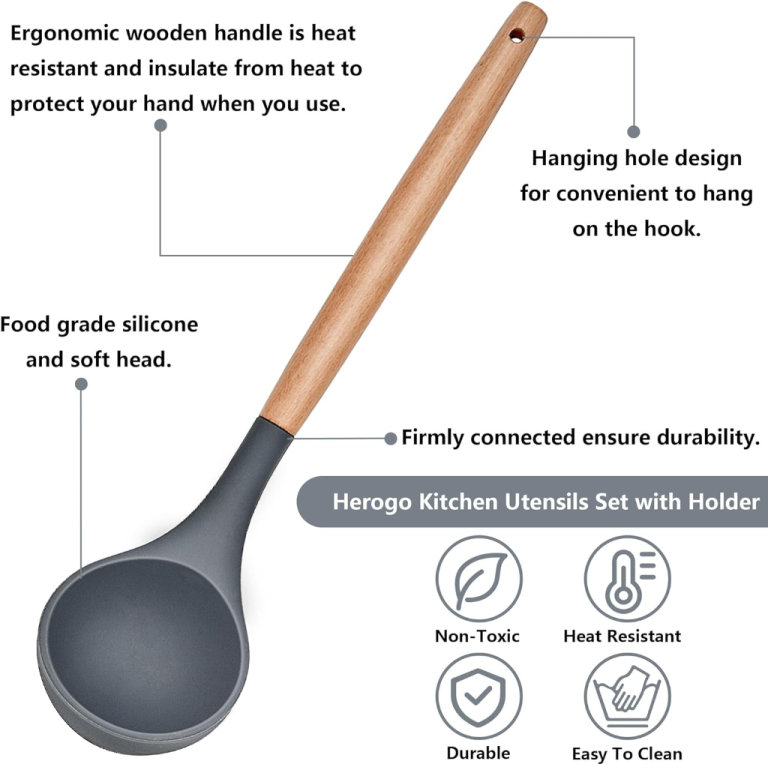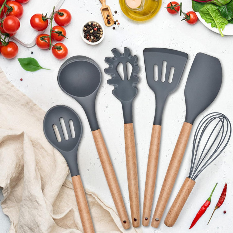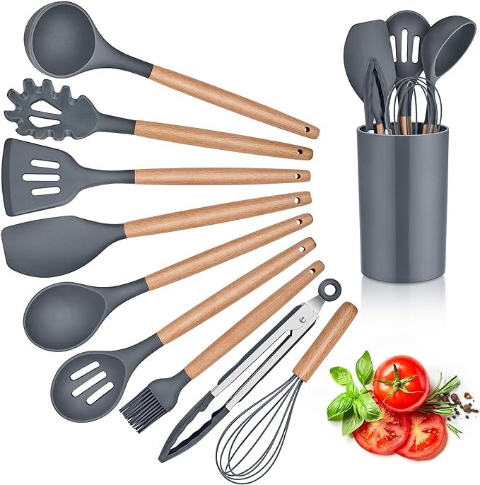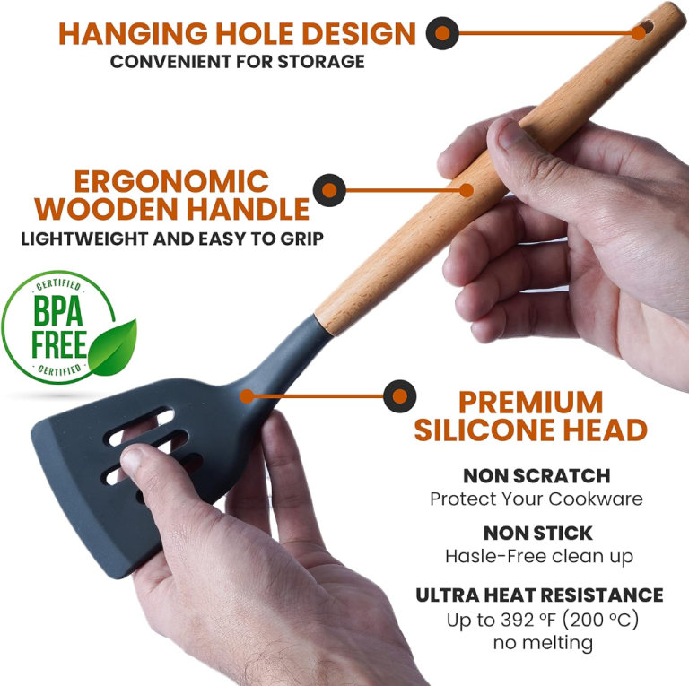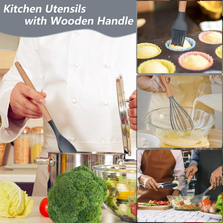 【ERGONOMIC DESIGN & DURABLE Our silicone utensil set are connected with wooden handle firmly to enhance durability, Cooking utensil with ergonomic design which is provide a great grip for you and hold comfortably, And natural wooden handles don't like the other cheaper wood, it is durable and won't break, melt or rust, durable for long time use