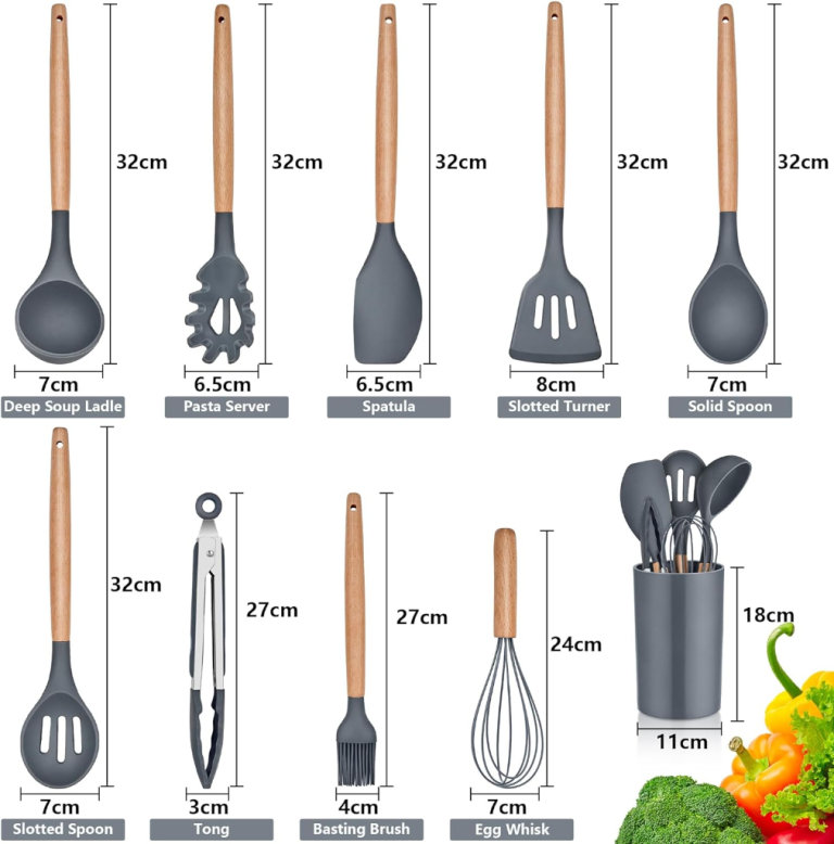 【EASY TO STORAGE Come with a plastic holder for convenient to storage, A utility hanging hole on each wooden handle and convenience to hang in your kitchen, Healthy silicone kitchen utensils allowing for safe and healthy cooking, As a great kitchen helper to cook more delicious foods for your family and friends