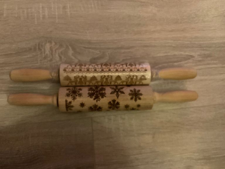 2 beautiful wooden rolling pins with imprints