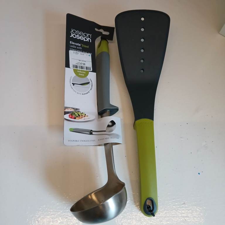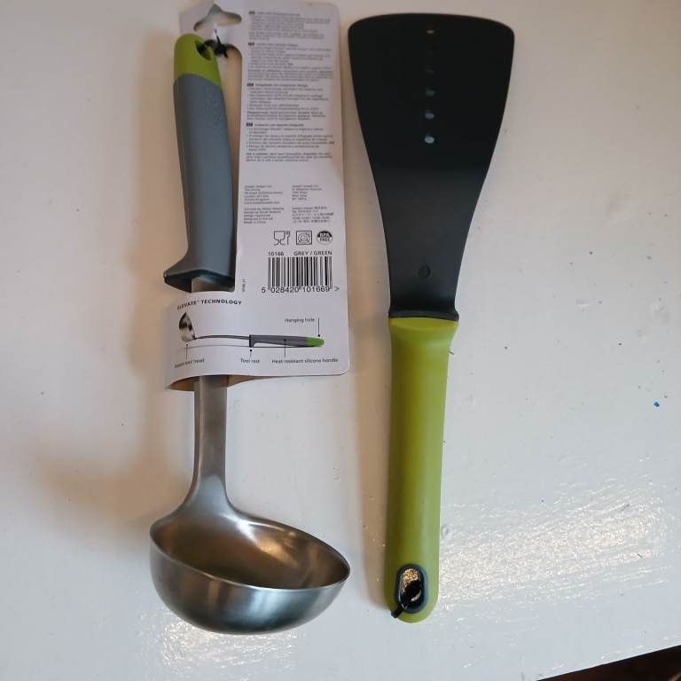 Grey/green utensils. Fish slice and stainless steel ladle. New with tags. Perfect condition.