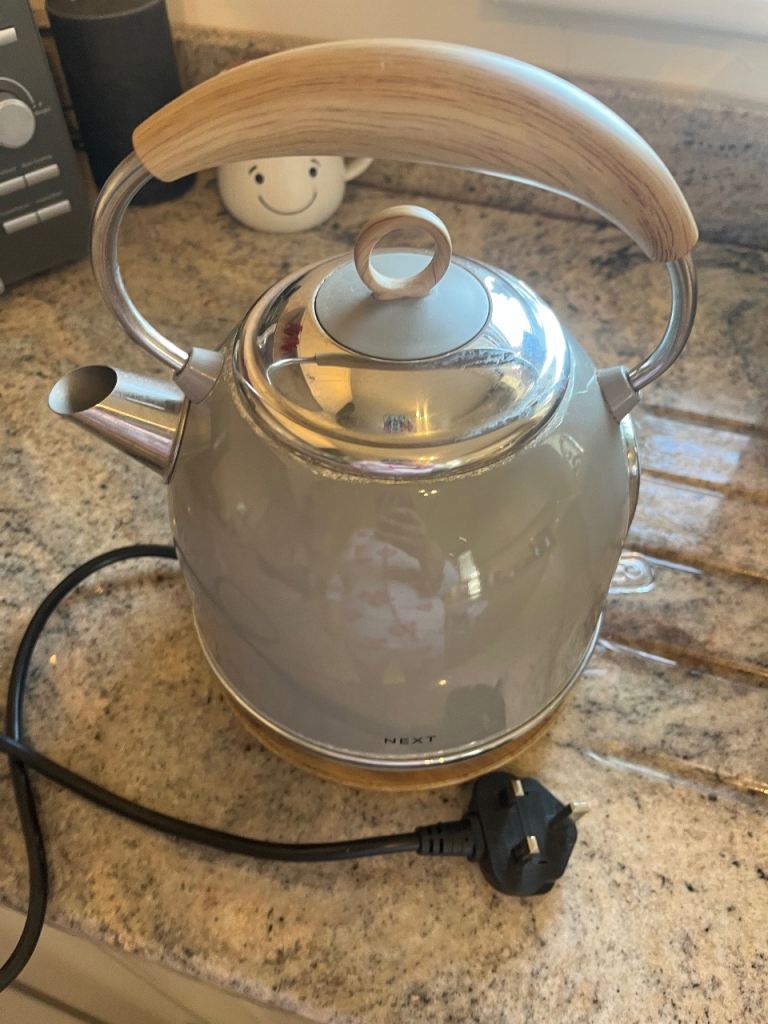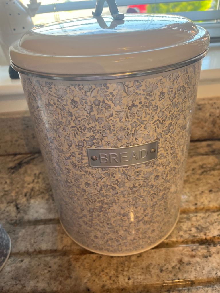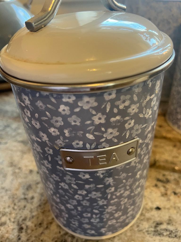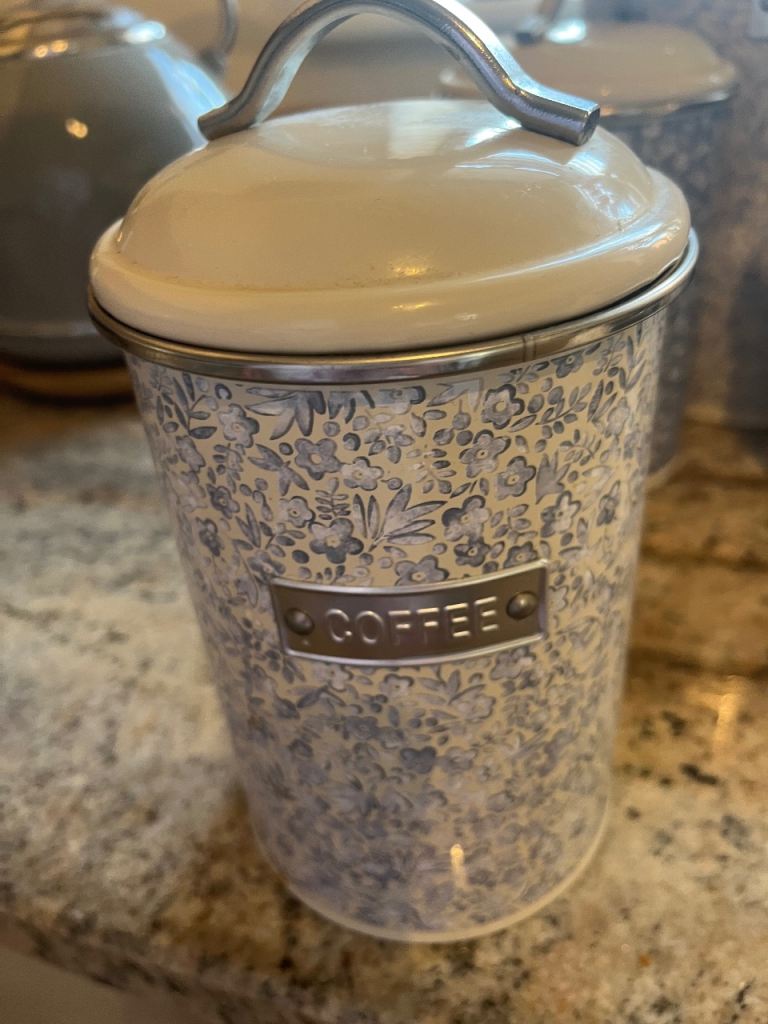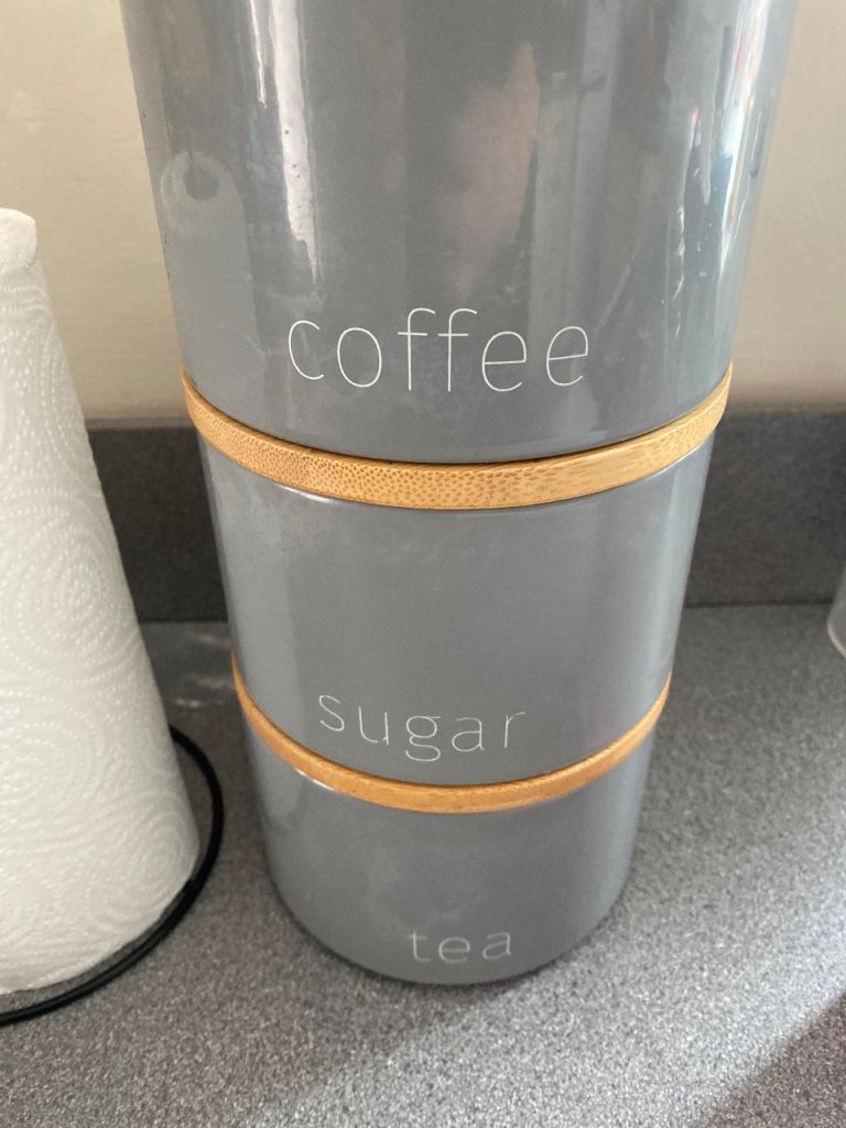 ‘Next’ Bluey/grey tea/coffee/sugar canisters with matching bread bin. Grey modern kettle in good working order