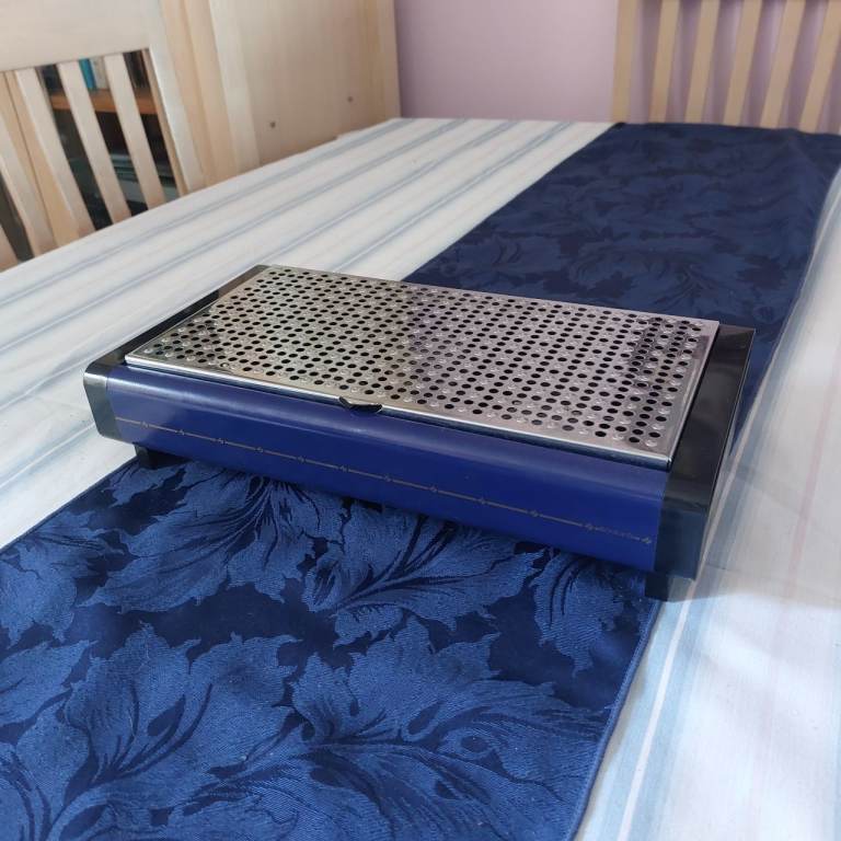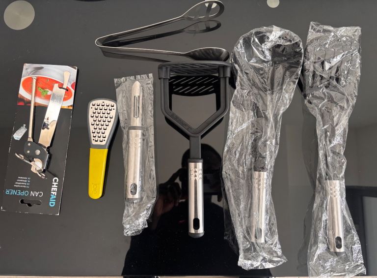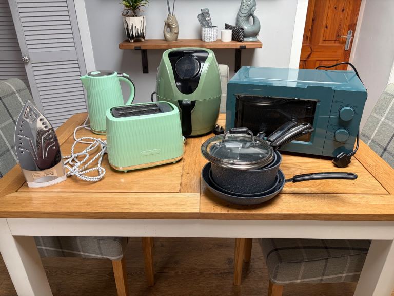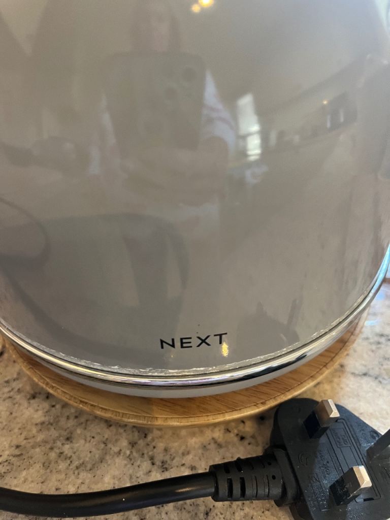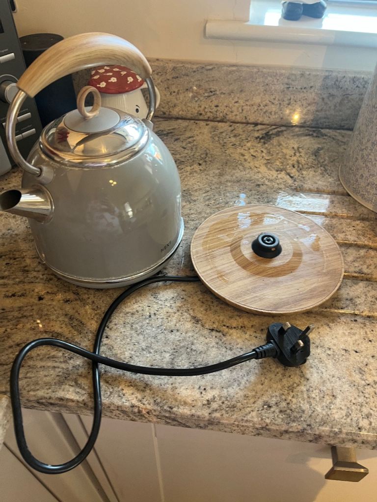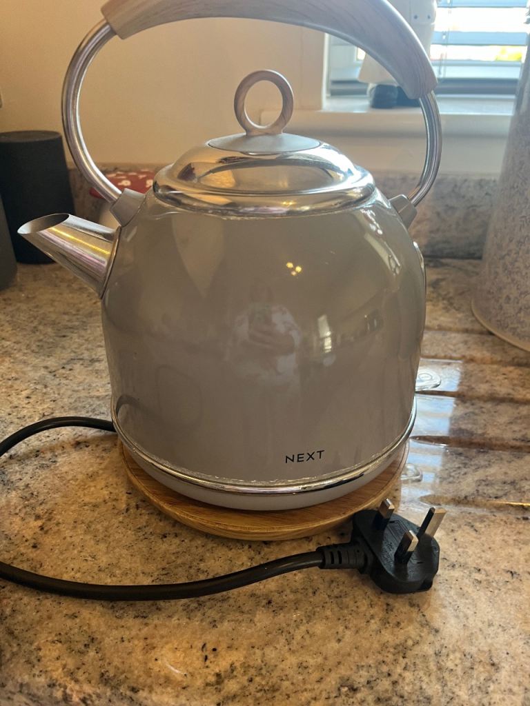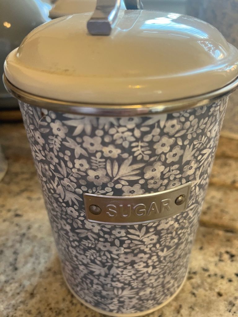 ‘Next’ Bluey/grey tea/coffee/sugar canisters with matching bread bin. Grey modern kettle in good working order
