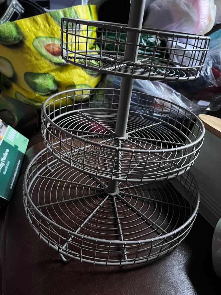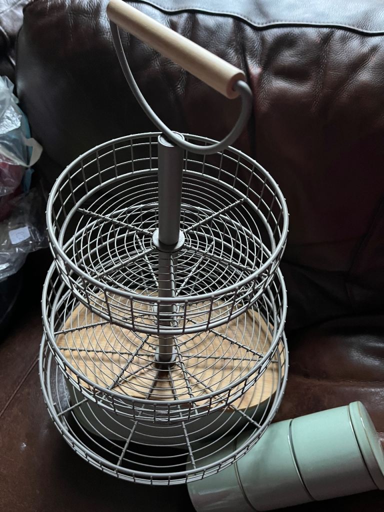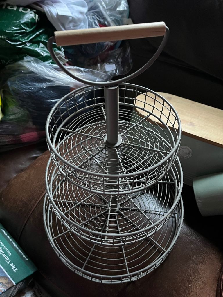 3 Tier Basket Stand in grey covered metal baskets and a handle to carry … can be used for a variety of things including carrying food (like for afternoon tea ) …. Cake stand … to house condiments /herbs n spices etc on your kitchen cupboard… £4