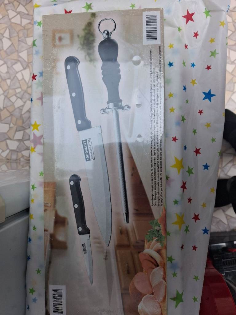Boxed kitchen stainless steel cook knife set. Brand new and never opened or used. Set includes 'cooks knife, vegetable knife and carbon steel sharpener' £12 ono Collection Dereham