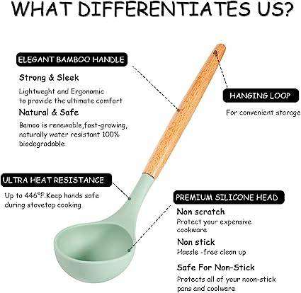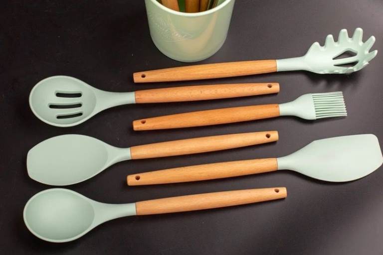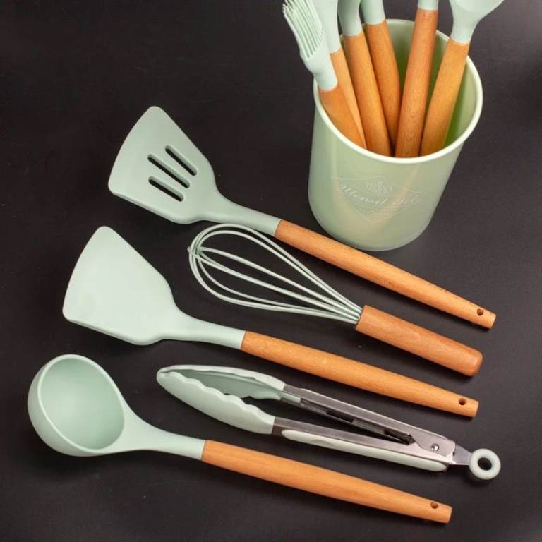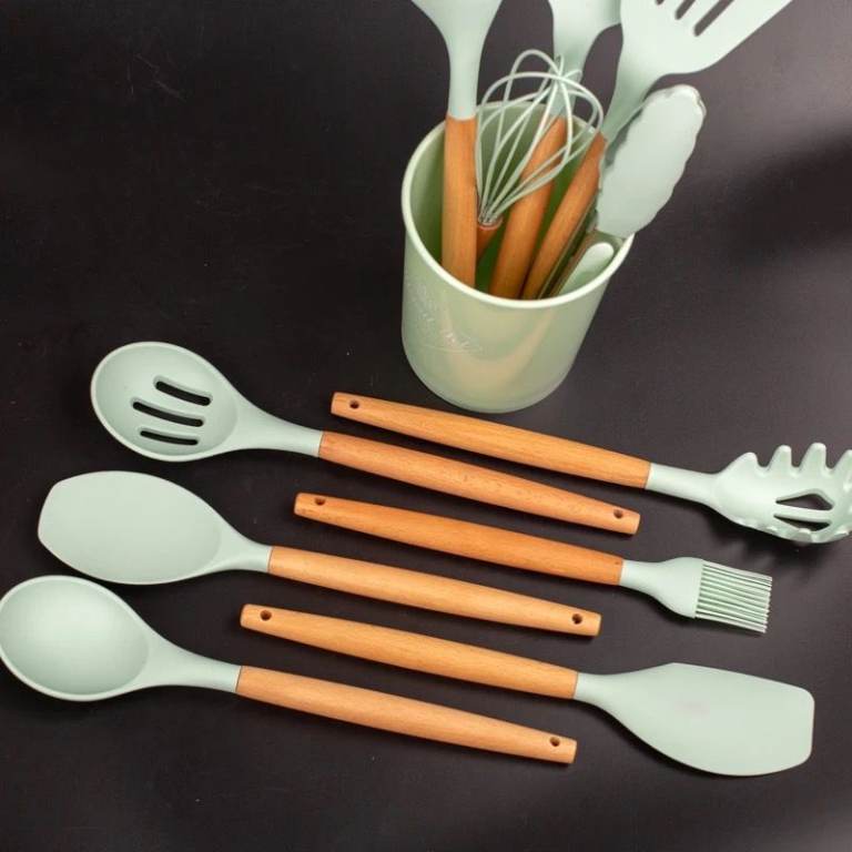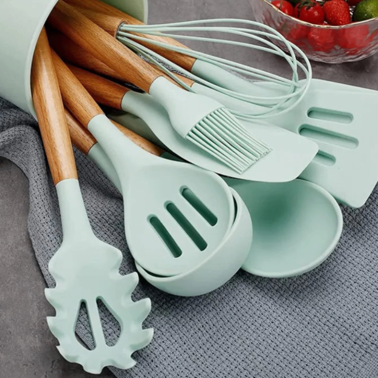 Posting for under a monthMint Green 12pcs Silicone Utensile Kitchen Set – Heat Resistant, Non Stick, Wooden Handles