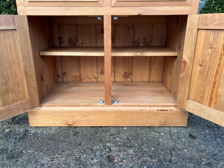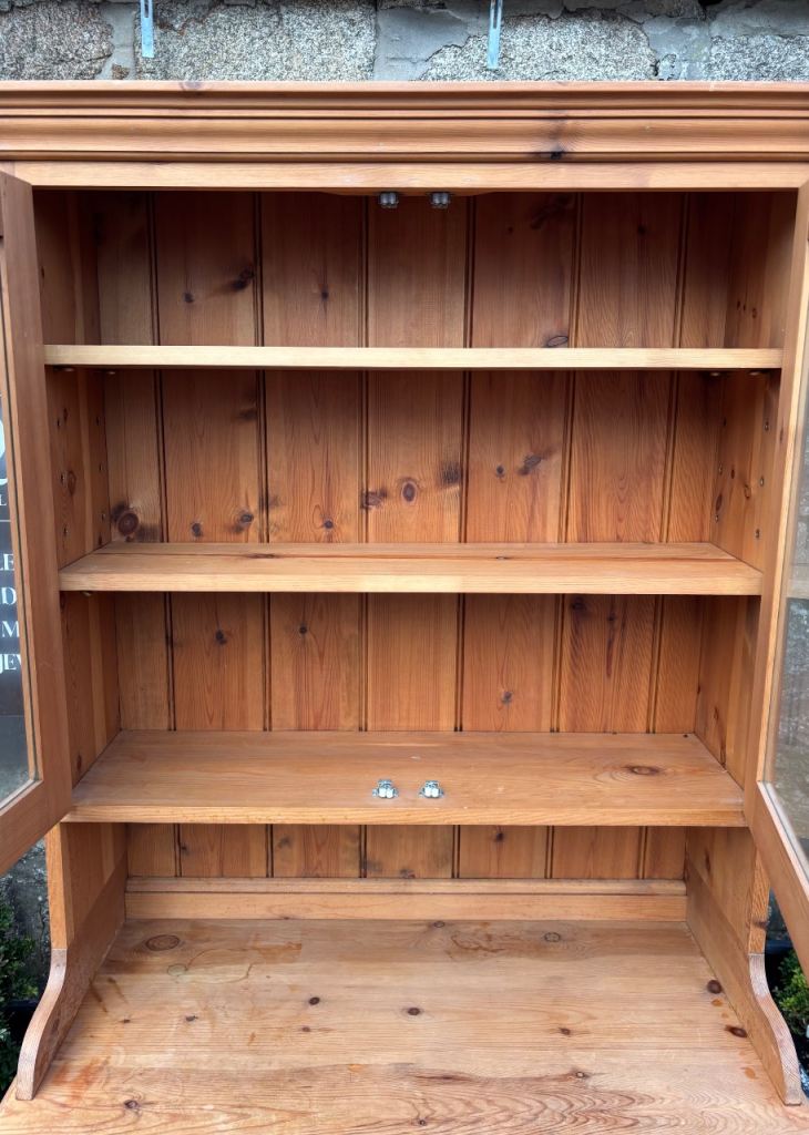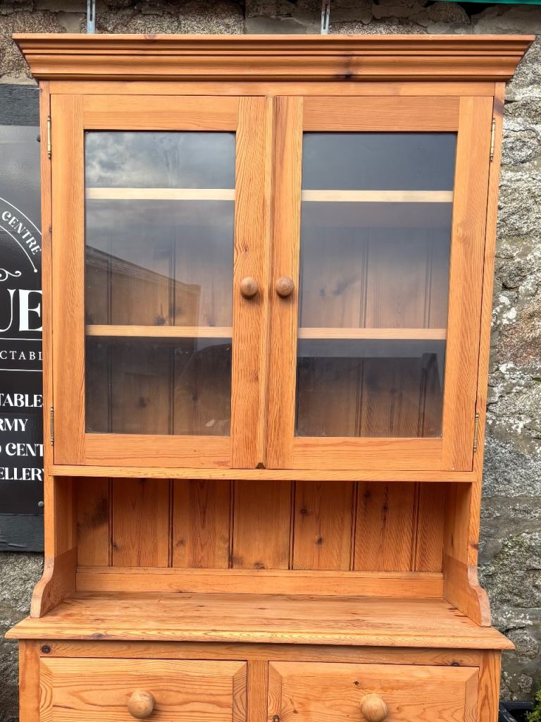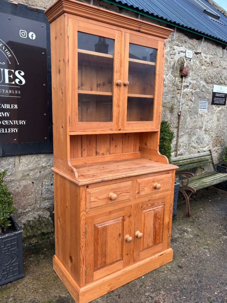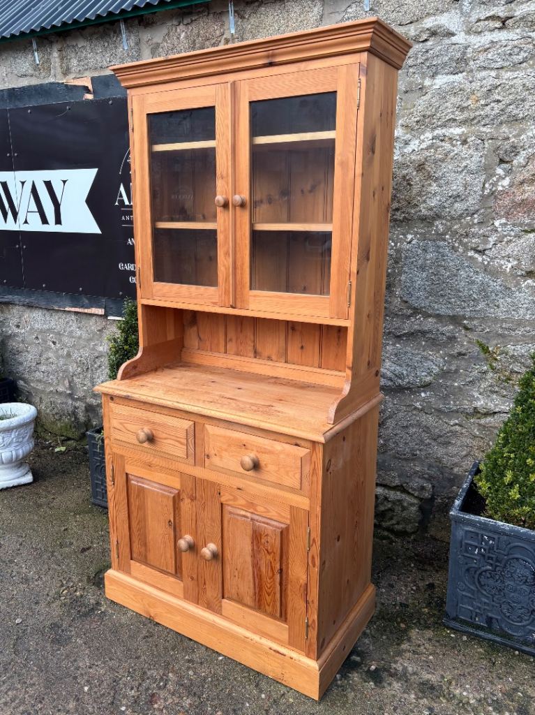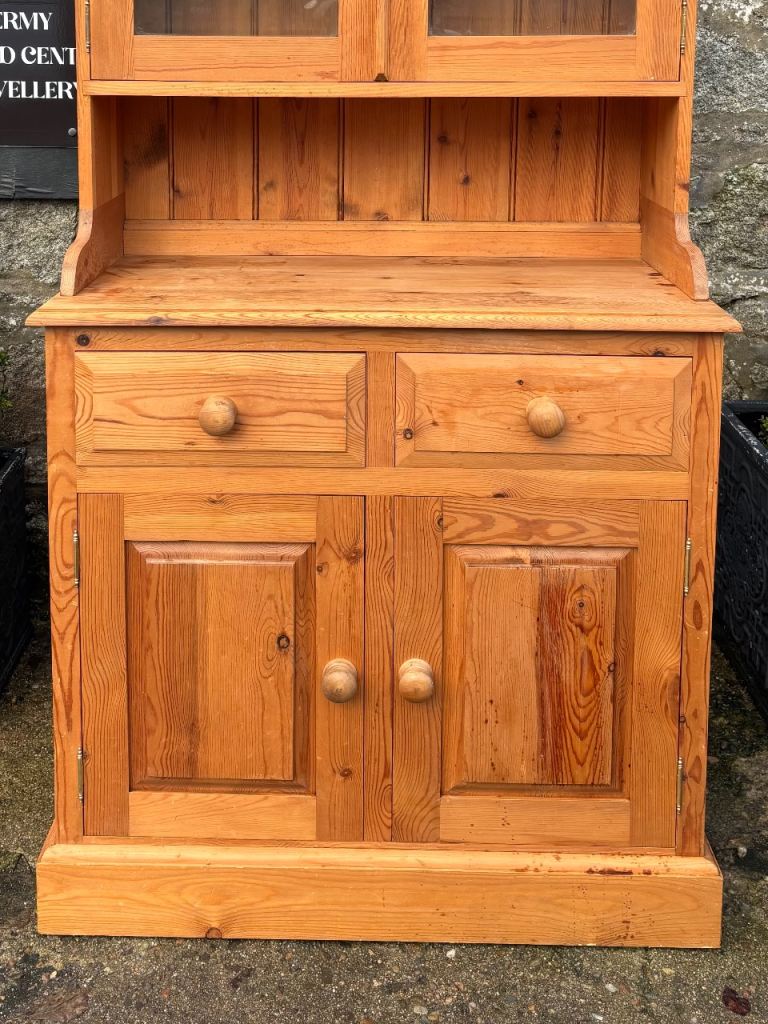 Narrow Pine Welsh Dresser Top with Shelves & Glass Doors & Base Cupboard with Shelf