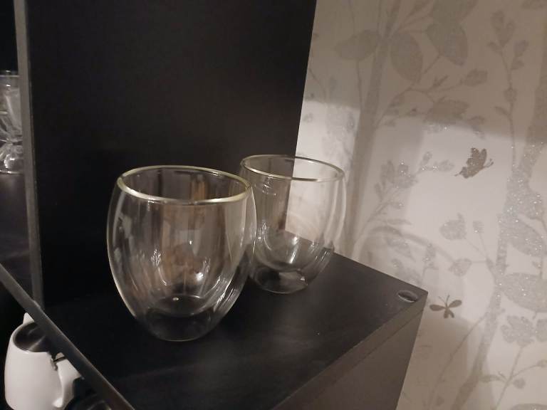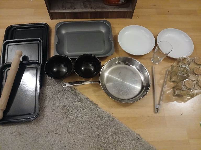 Selection of Kitchenware, Waitrose and Restaurant Items, as in the images. 3 Large Sharing Platters New, 4 Waitrose Glasses, 2 Latte Glasses, 2 Restaurant Latte Glasses, 4 Ice Cream Sundae Glasses, Plates, 14 Restaurant Quality Glasses. 4 Baking Trays, Rolling Pin, 2 Bowls, 6 Tea Jars with 4 Corks, 2 Waitrose Bowls, Tongs, Large Pan, Extra Baking Tray, A lot of it new, some used. TABLE NOT INCLUDED.