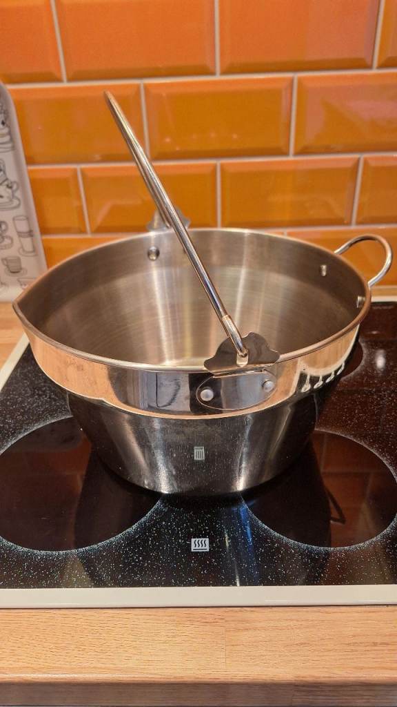 Heavy duty stainless steel preserving pan with lip and handle and 5lr double handled pan for preserves, soups, stews, etc. Will sell separately £10ea or together £17.