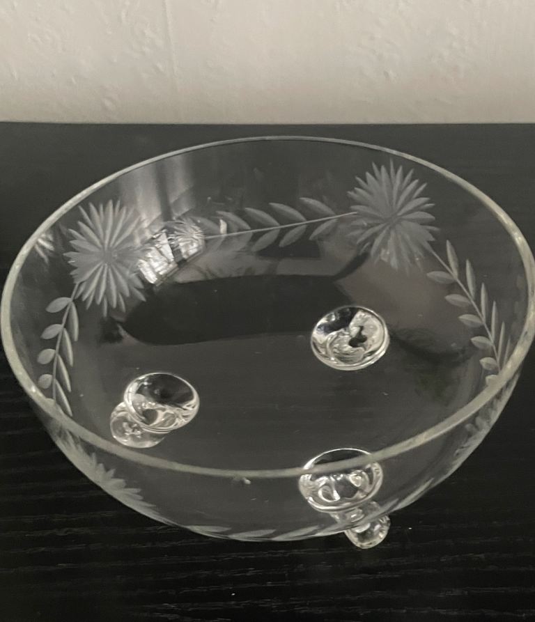 Set of 5 etched 3 footed glass floral cut