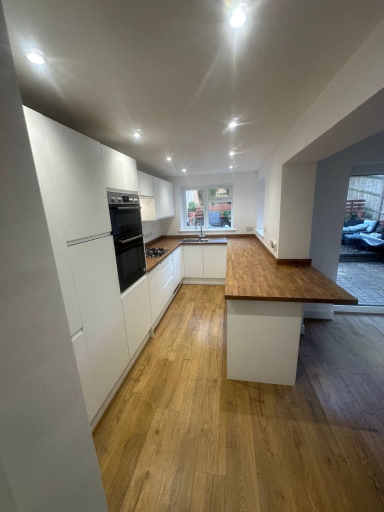 The project included plastering, rewiring lights and sockets, installing a media wall, fitting new internal and external bifolds, adding a skylight, laying flooring throughout, and installing a brand-new kitchen. Every part of it has been completed to an exceptionally high standard.