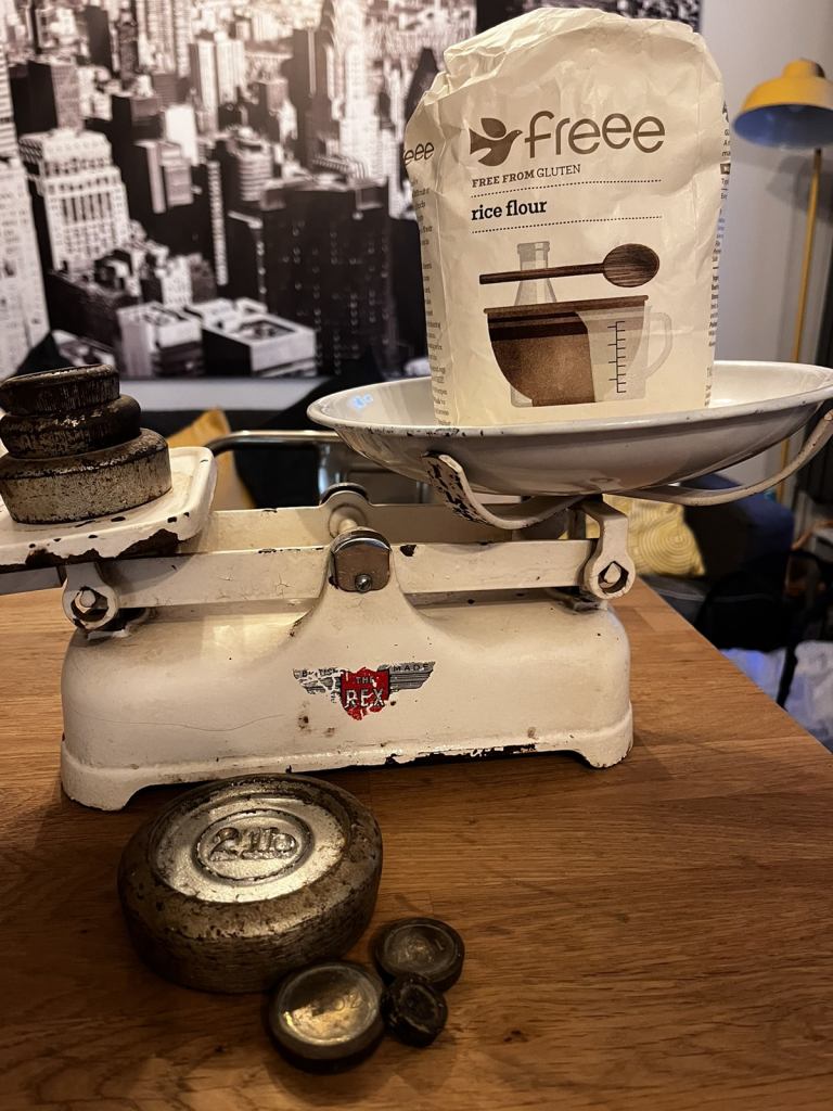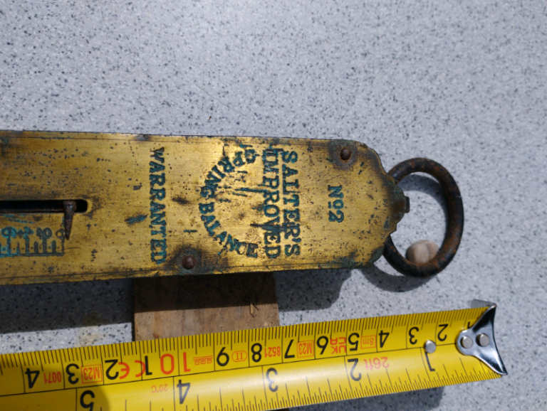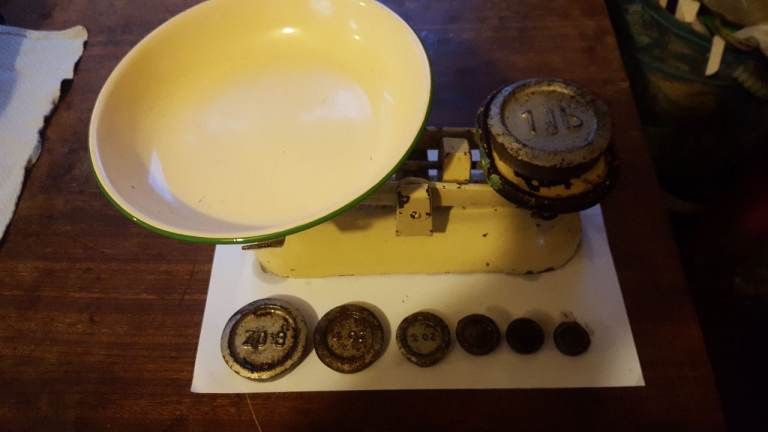 They have been handed down through 4 generations of our family where they were used to weigh coffee beans sold by family wine merchants based in Northwich , Cheshire. The scales work perfectly and are in very good condition. Base 50cm long x 27cm wide, height from bottom of base to top of scales 59.50cm