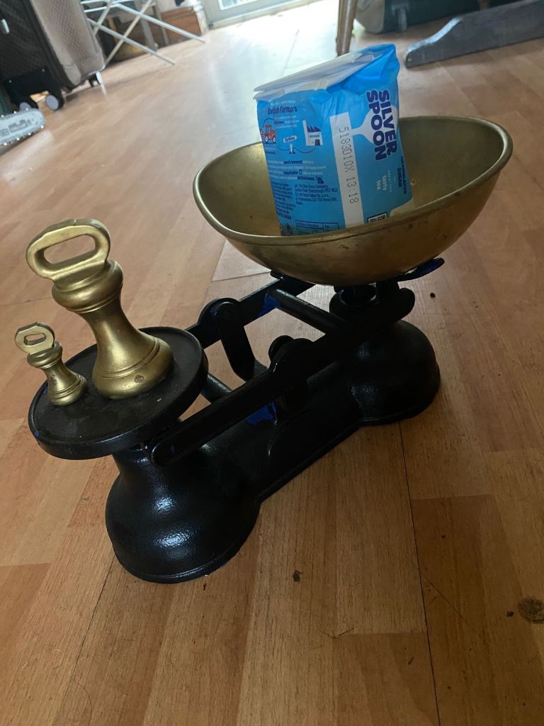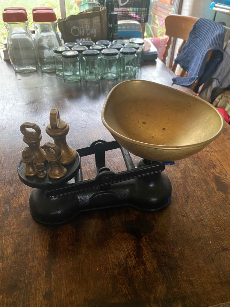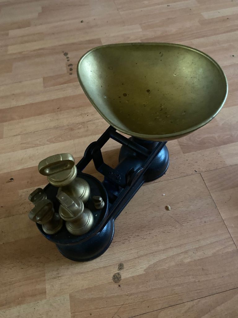 Vintage set of balance scales, typically used for kitchen or market purposes.