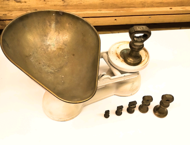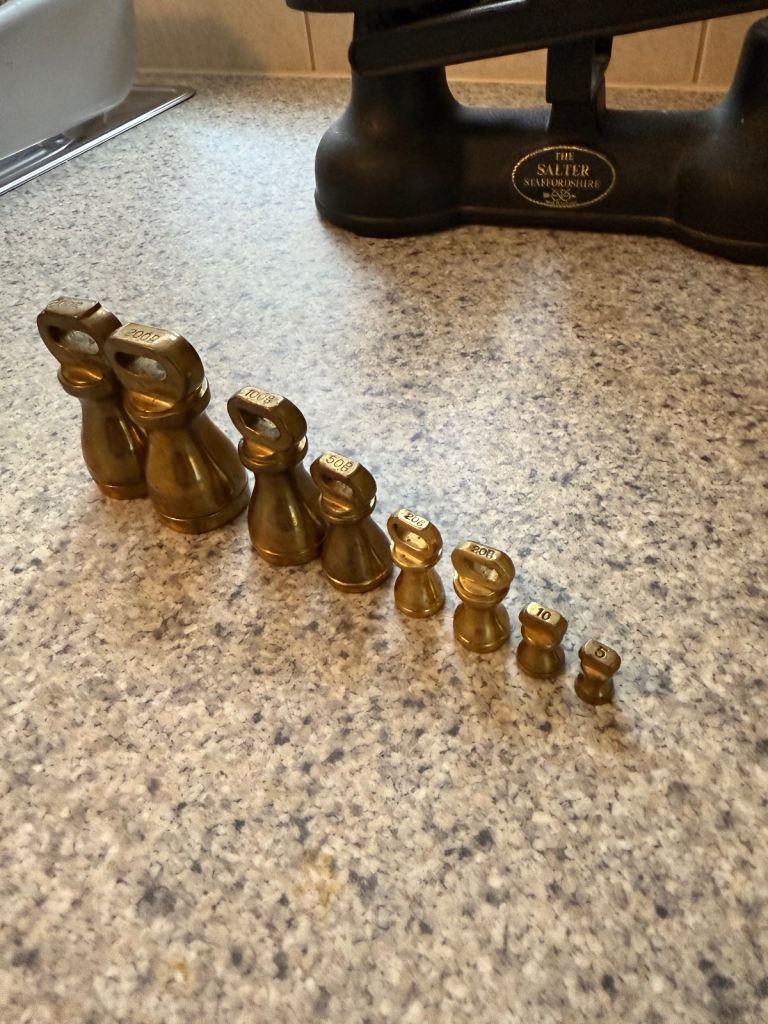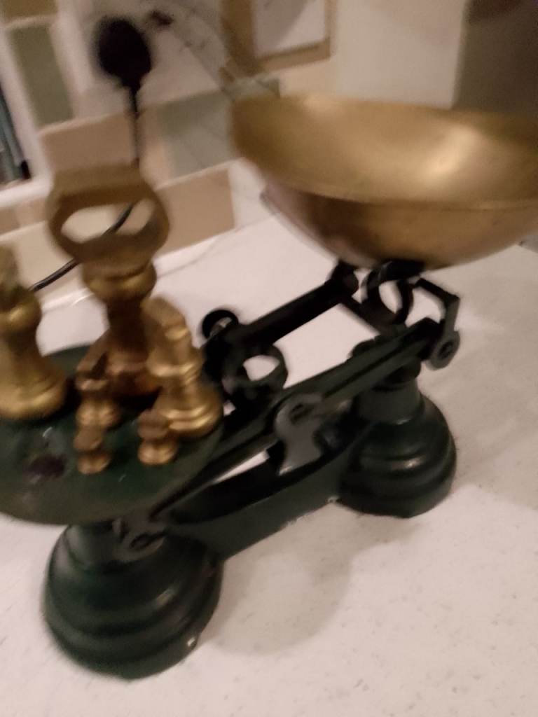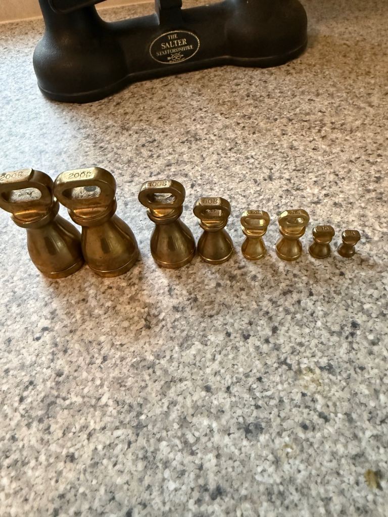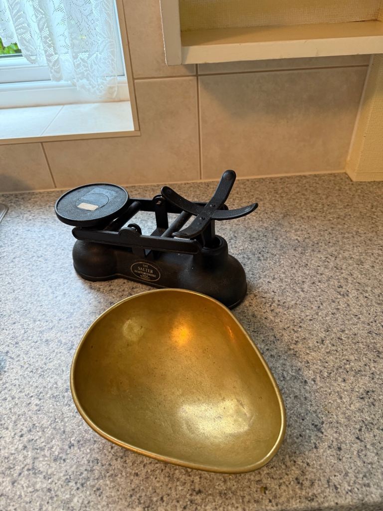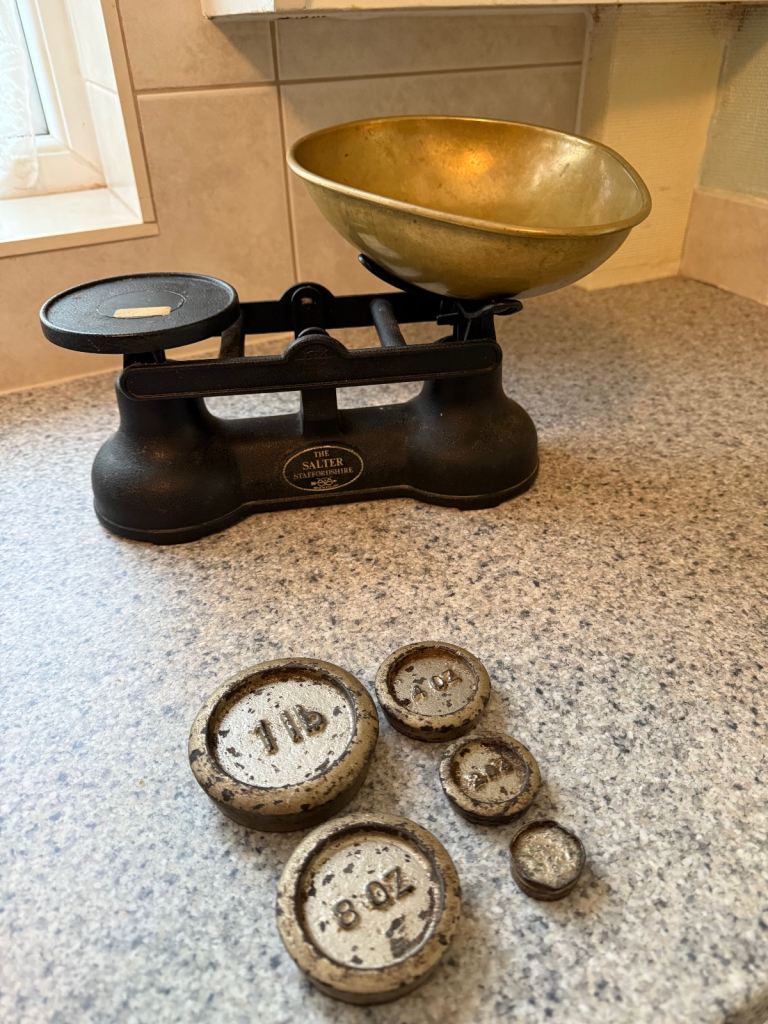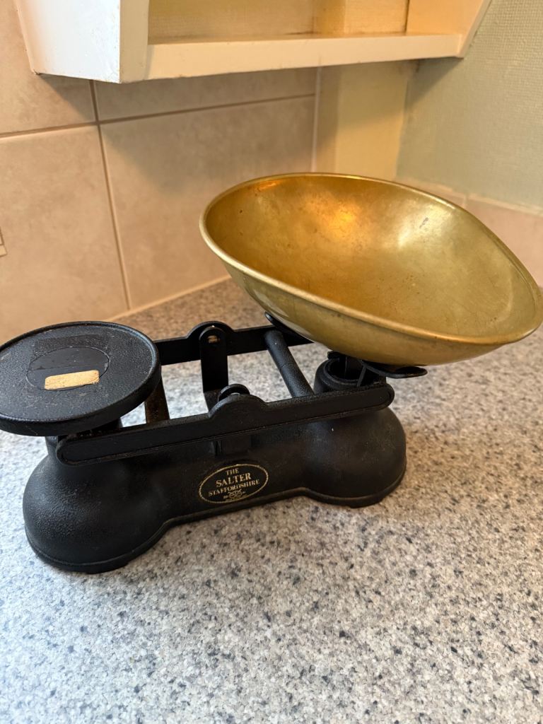 I have for sale a set of vintage kitchen scales. Together with a set of weights in metric and a set of weights in imperial. Please note the smallest weight in the imperial is “home made” as the original one is mislaid. There is some wear and tear commensurate with the age, hence the price, however, they work and would be an ideal item for up cycling.