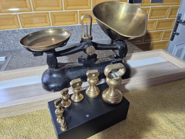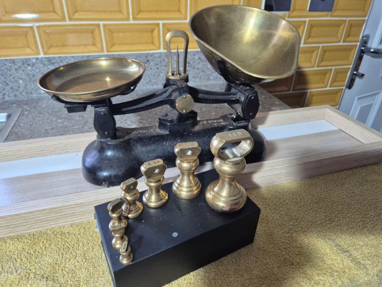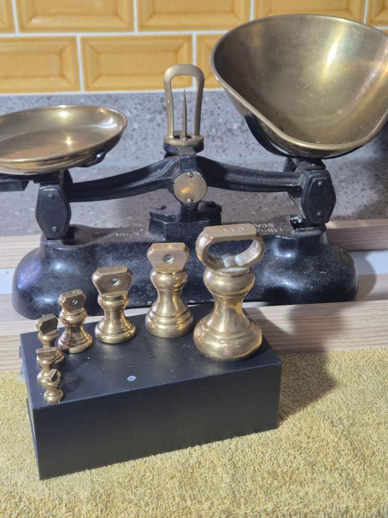 Libra Antique Weighting scales with brass bowl and weights . In good working order . A collectors item