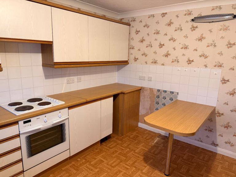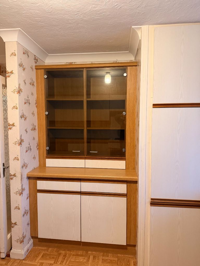 With oak trim, good order, nice and solid. Bosch electric oven and extractor. Glass fronted display unit. Inset stainless steel sink with mixer tap. Timber effect worktop.