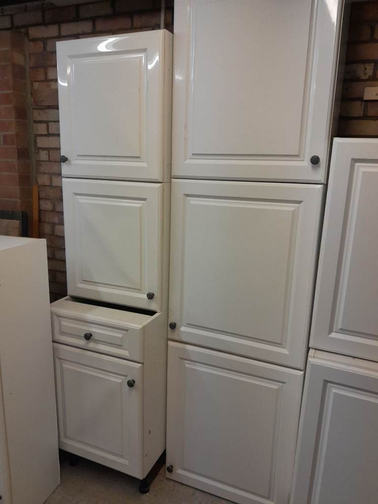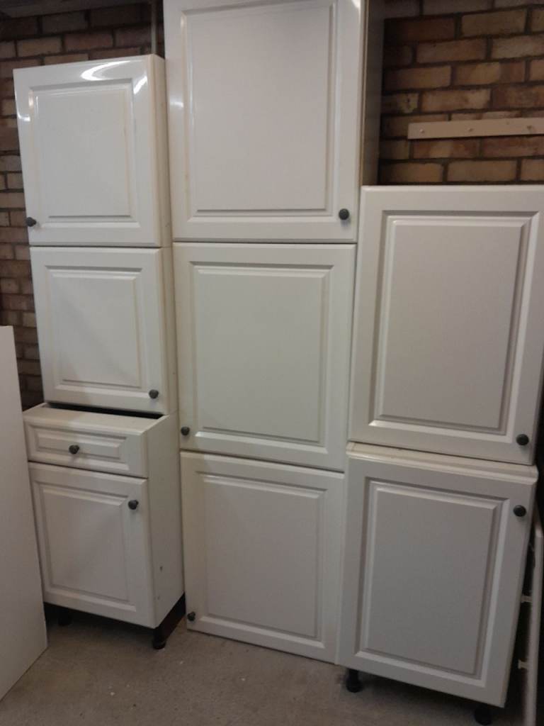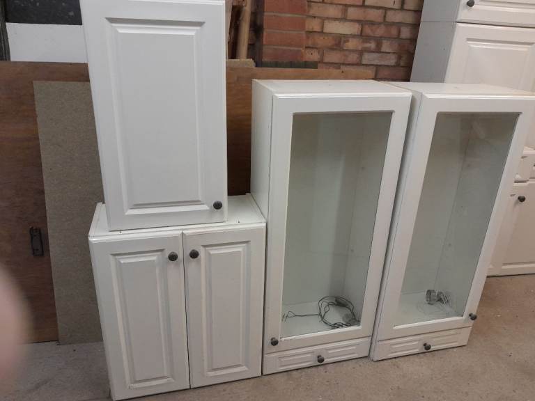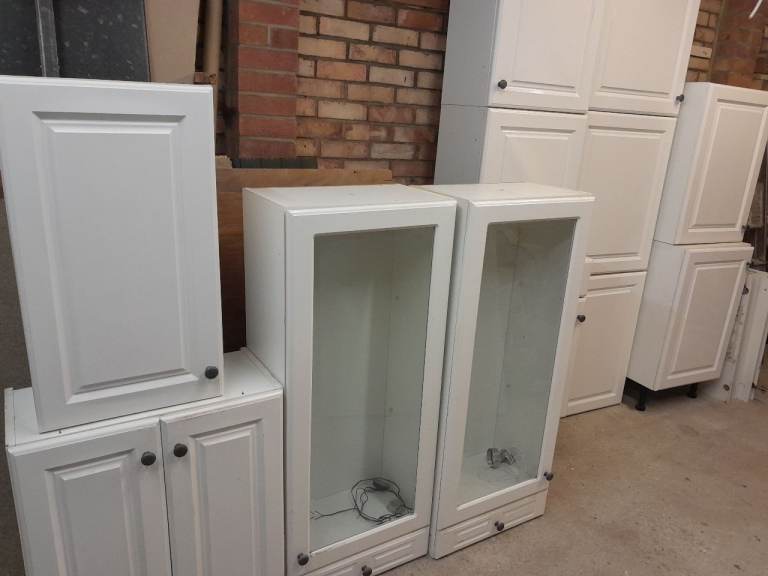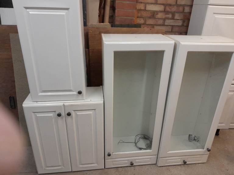 Free, Kitchen base and wall units white gloss. Ideal for utility, garage or shed. Fair to good condition.
