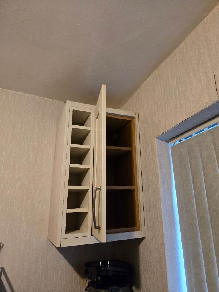 - Wall-mounted cabinet with a combination of open cubbyholes and a closed compartment, perfect for organizing dry goods, utensils, or cleaning supplies.