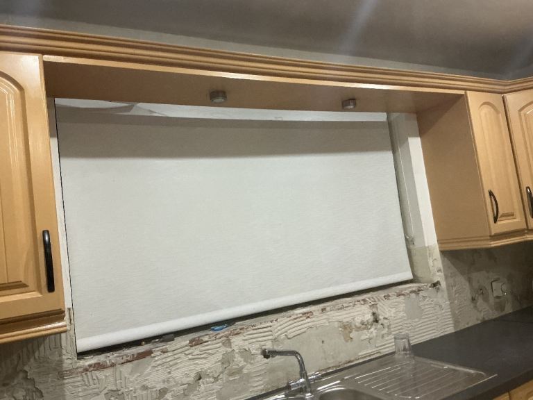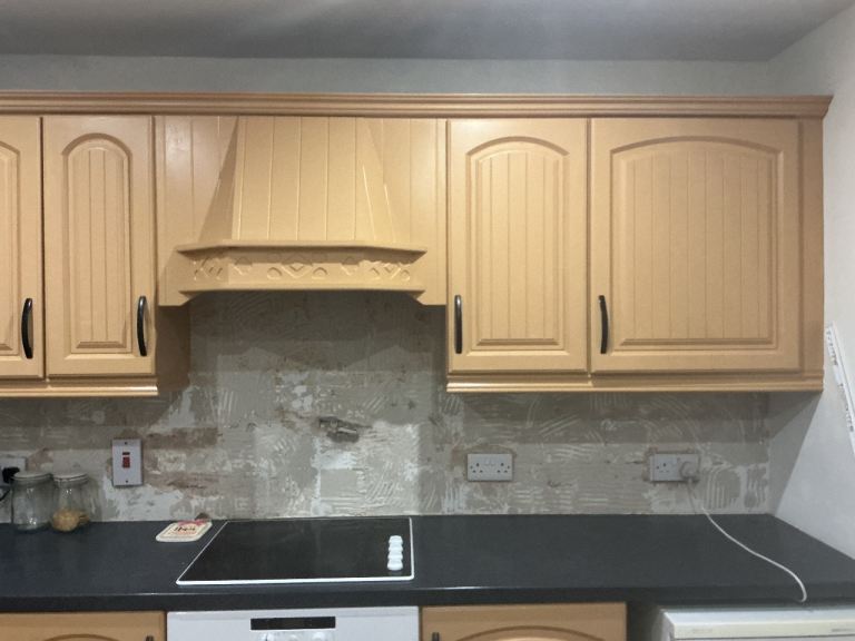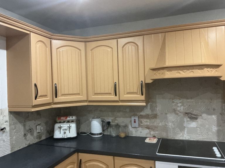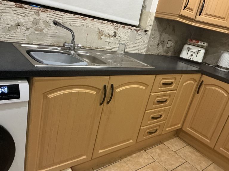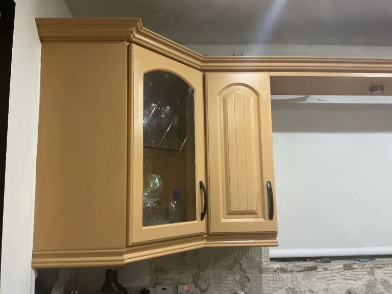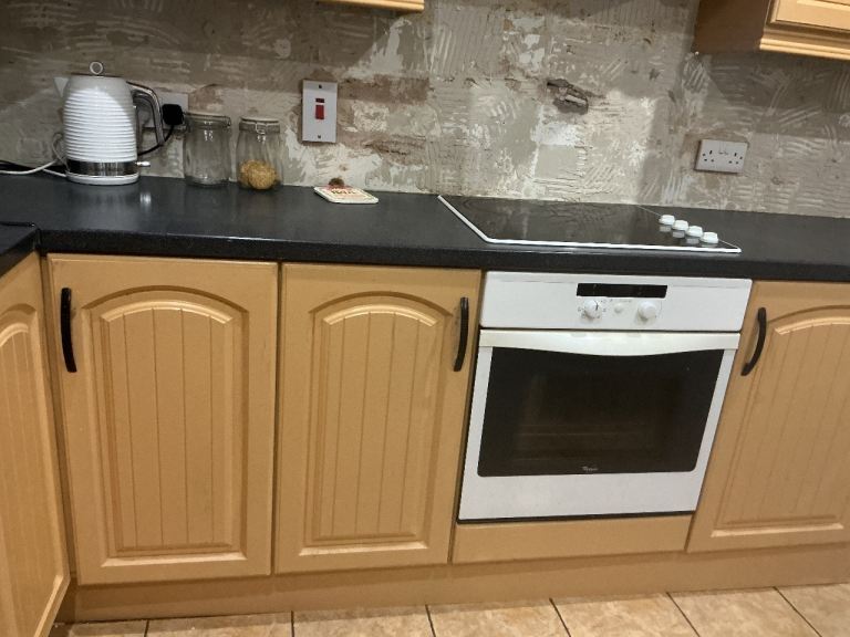 All units available mid march, top units can be taken earlier. Free to whoever wants and can dismantle and take away. Well used kitchen. Good for re-spray, parts. Includes all top and bottom units, sink unit and taps. Hob and oven ( working order) if wanted. Recirculating fan not working . Current kitchen is approximately 12ft x 10 ft work tops also included ( well used) visibly.