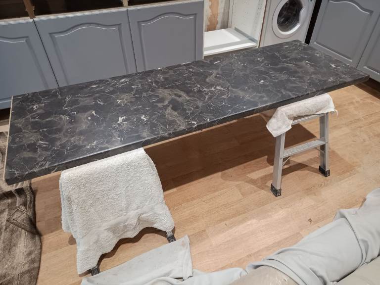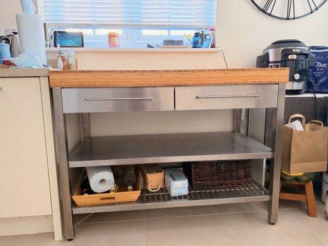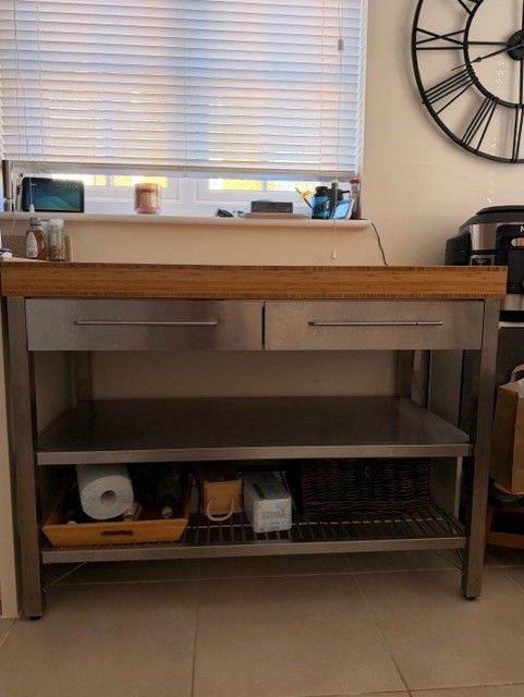 The countertop is made in bamboo which is an easy-care and durable natural material. Bamboo is a durable and stable hardwood with a uniform texture. Gives you extra storage, utility and work space. You can switch the places of the various shelves to suit your storage needs. The hooks on the side of the workbench are perfect for hanging utensils or towels. Adjustable feet. Buyer to pick-up however, happy to partially dismantle for ease of transport.