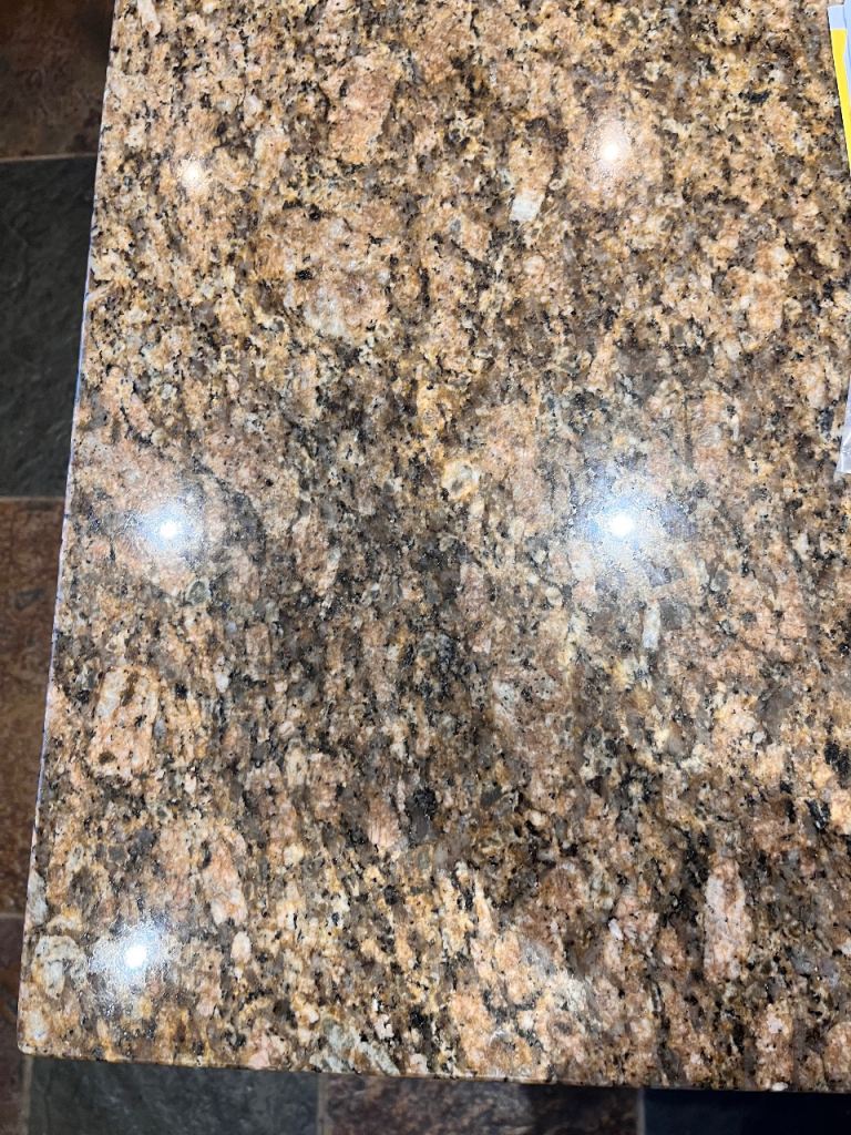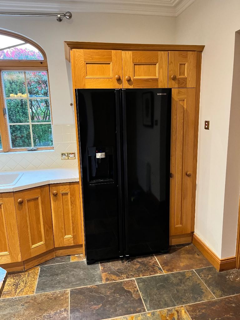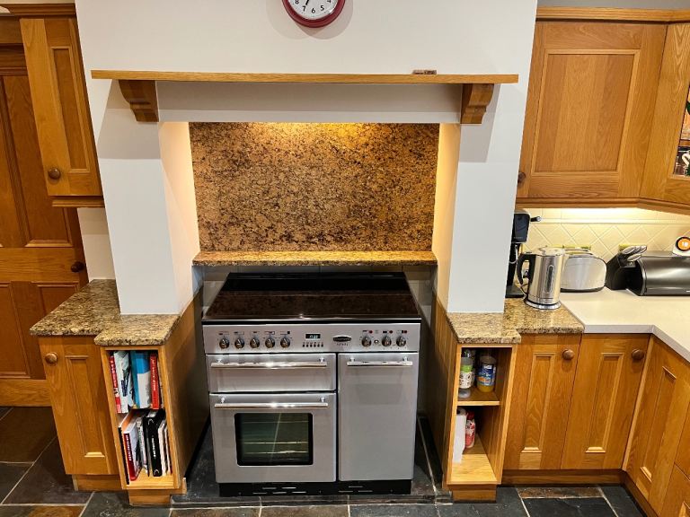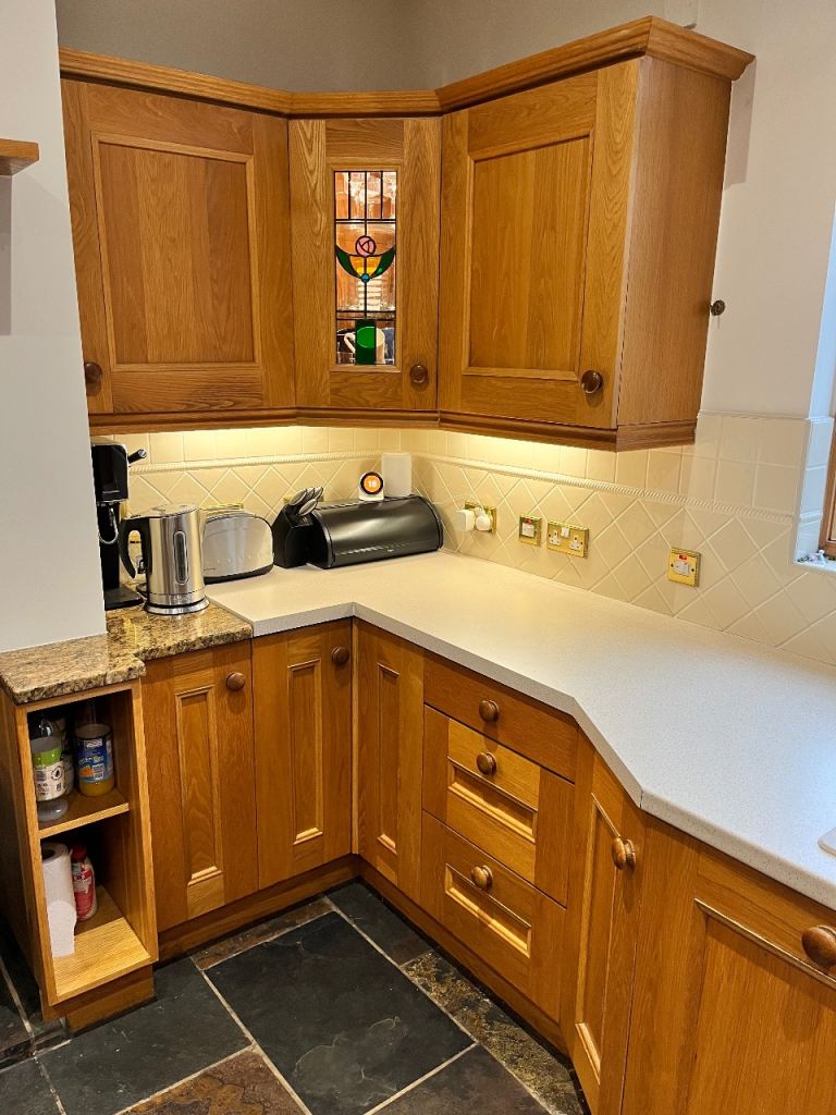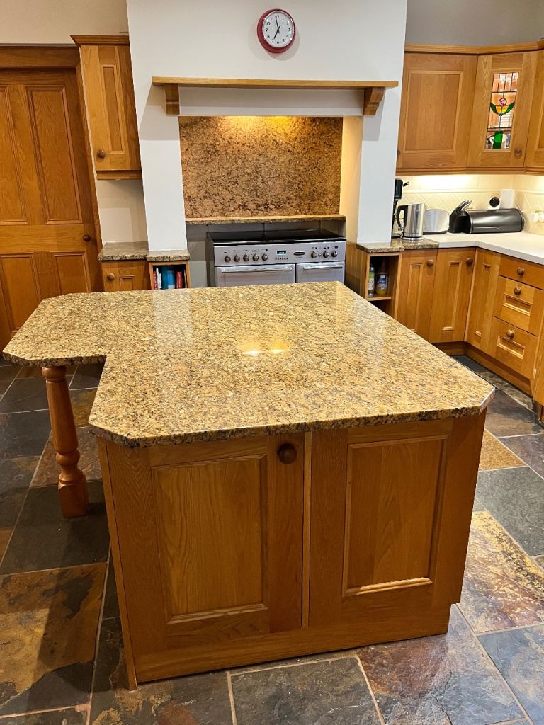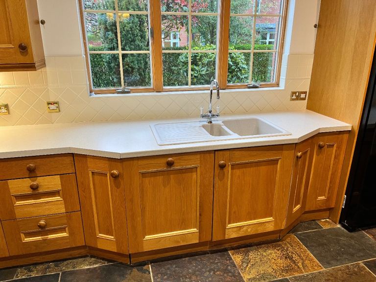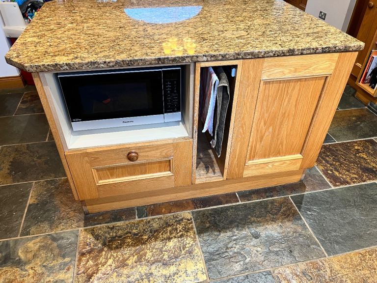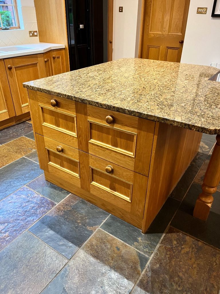 Solid oak kitchen units, including wall and base cabinets. Comes with a matching central island. Granite worktops as shown in photographs. Good used condition overall, showing some natural wear consistent with age. Fridge, stove and appliances not included