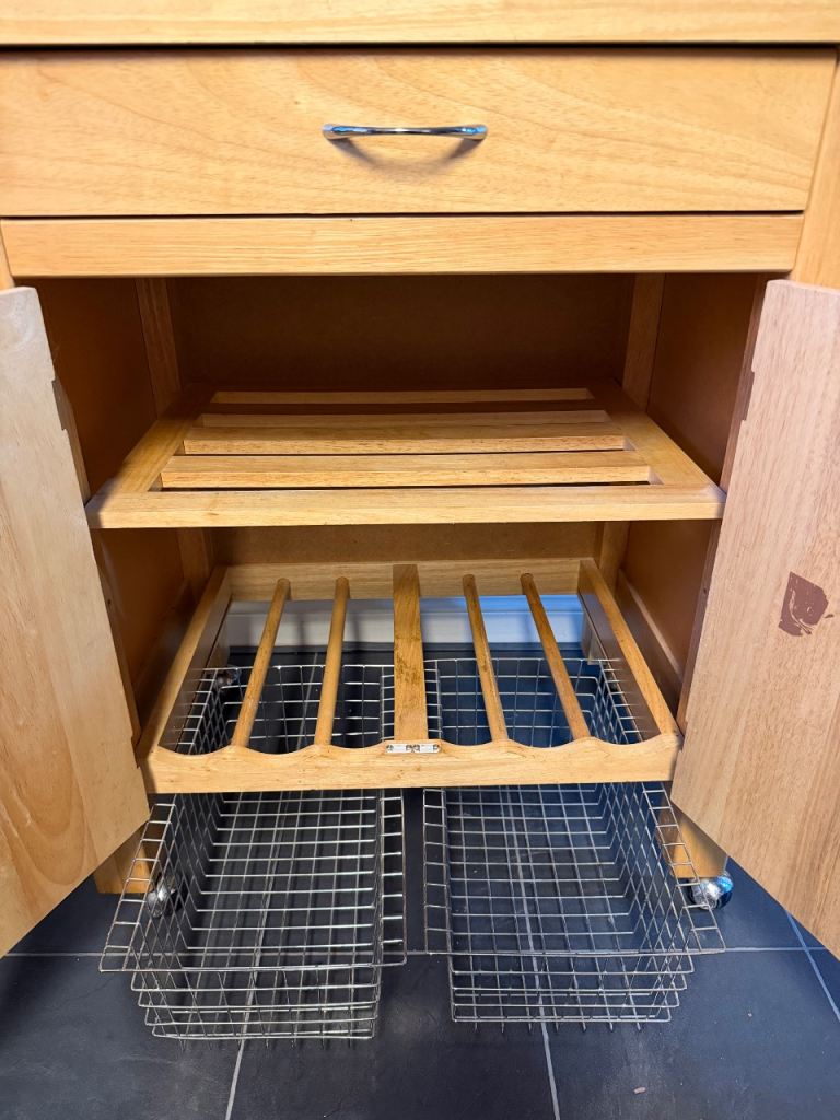 Features a wide drawer, two cupboard doors revealing internal shelving, and two pull-out wire baskets at the bottom.