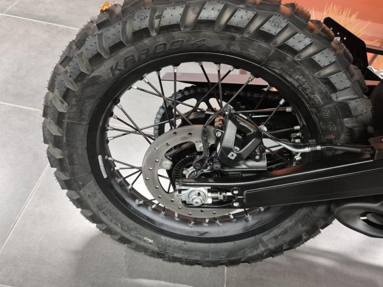 Wheels & Tires: Rugged 21″ front and 18″ rear spoked wheels.