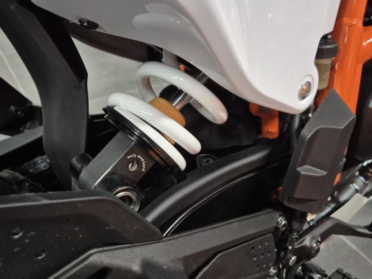 Frame & Body: Two‑piece steel trellis frame (main section plus bolt‑on subframe) teamed with a gravity‑die‑cast aluminum swingarm. Ergonomics echo KTM's larger Enduro models, with a flat, one‑piece seat, slim, off‑road focused bodywork, and a compact 9 L fuel tank