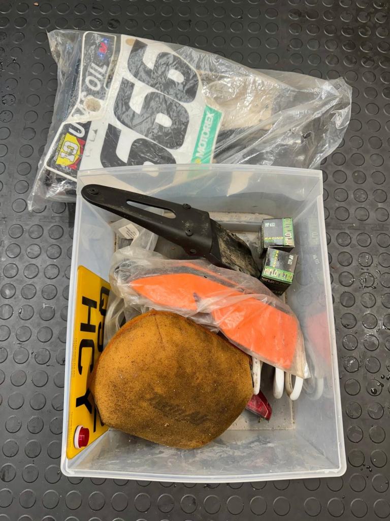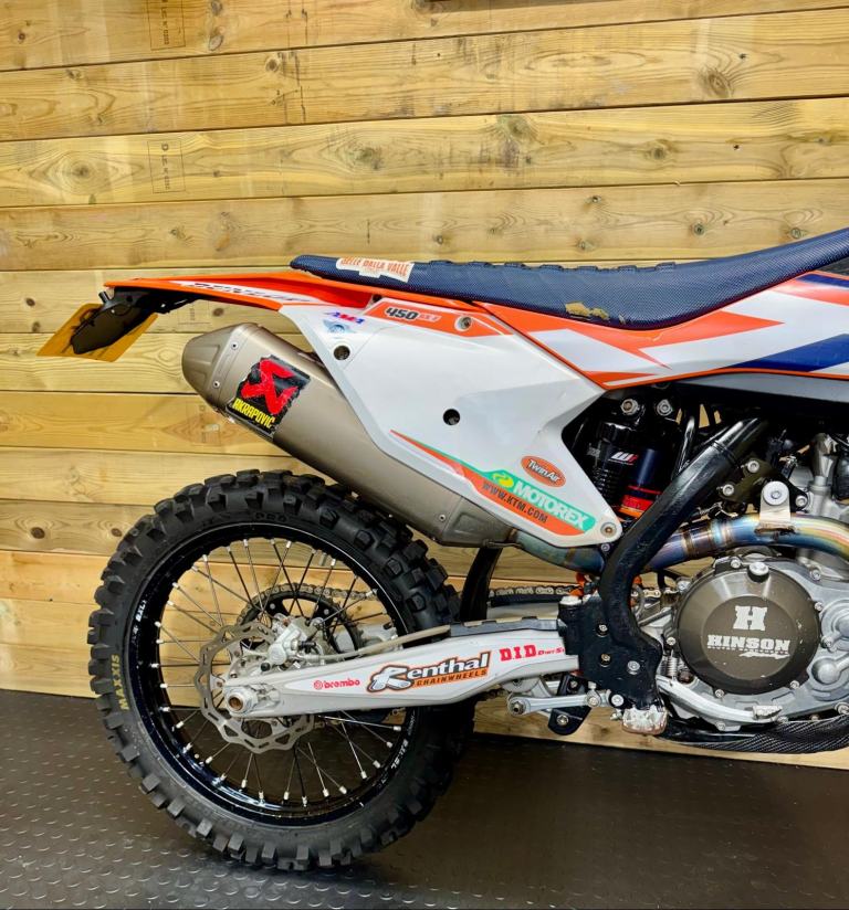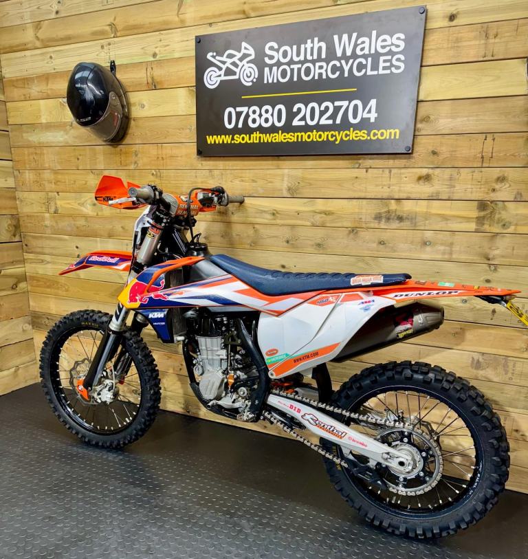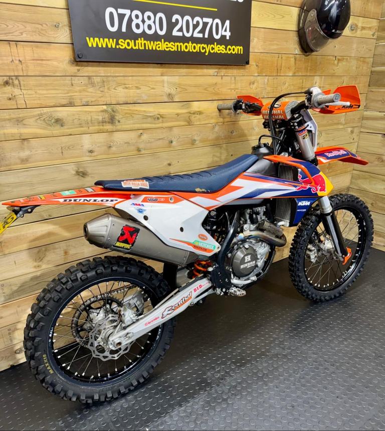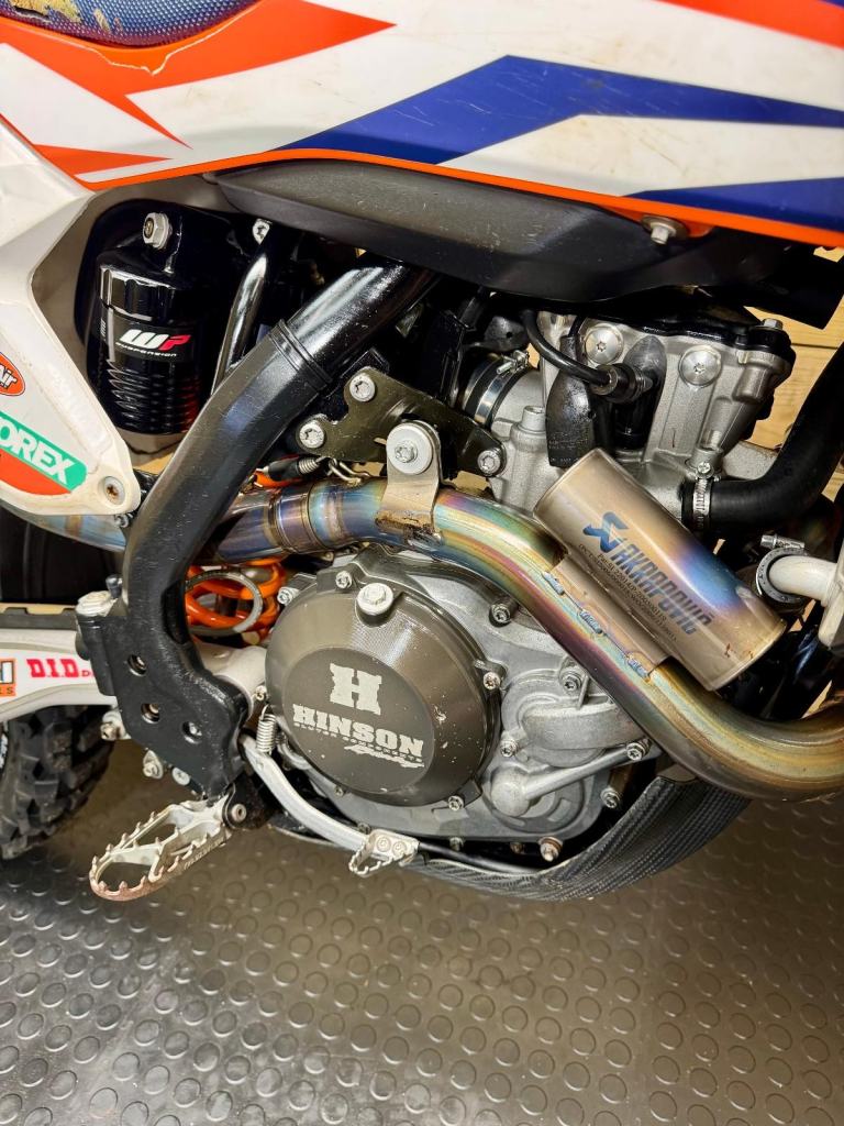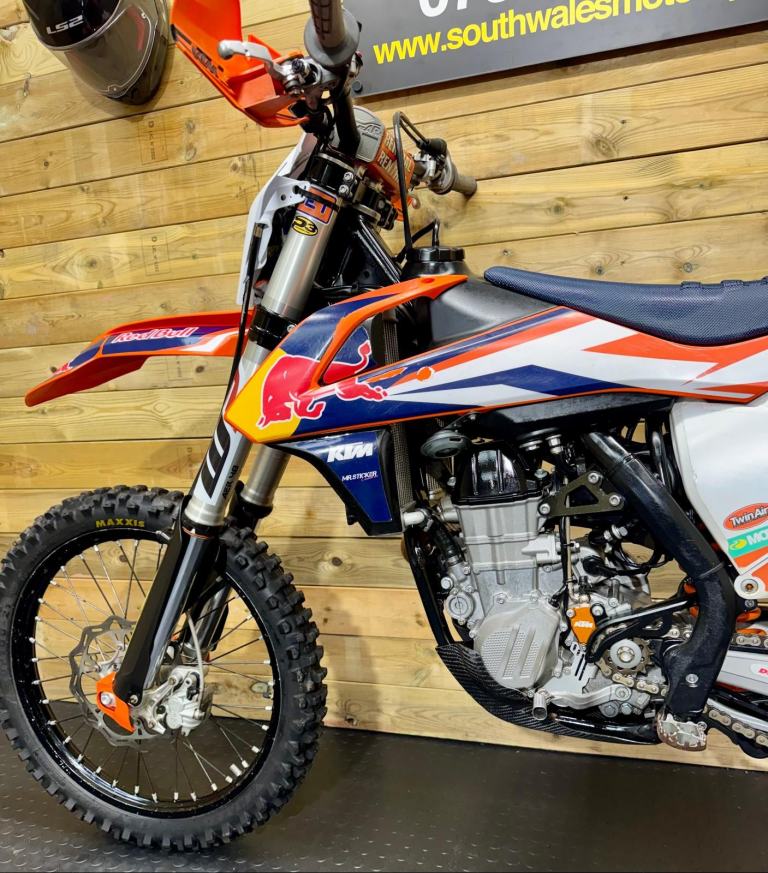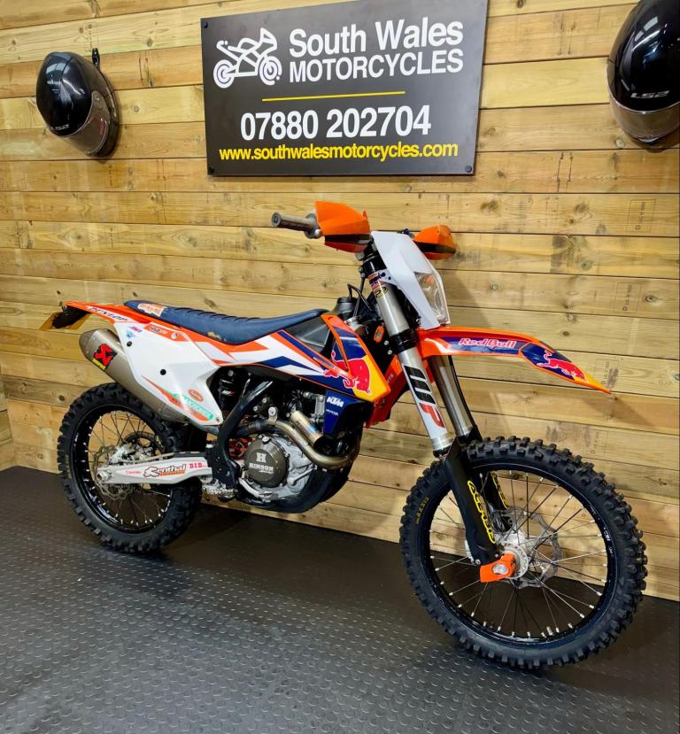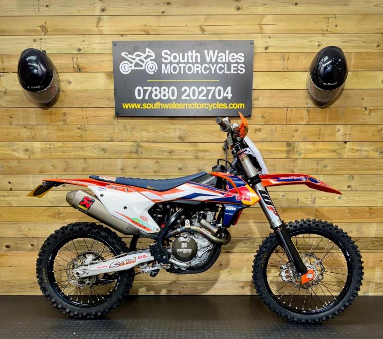 A fully loaded, factory edition KTM450 SXF. Bought new in 2016 and road registered straight away. Electric start, full Akropovic, Hinson clutch cover, hour meter fitted (obvs), gripper seat cover, hand guards and carbon sump guard - to name just a few of the extras. It also comes with a ‘box of bits’. Starts straight off the button and rides perfectly. The V5 is here, ready to transfer. We’re happy to add a day time MOT. She’s ready to ride away!