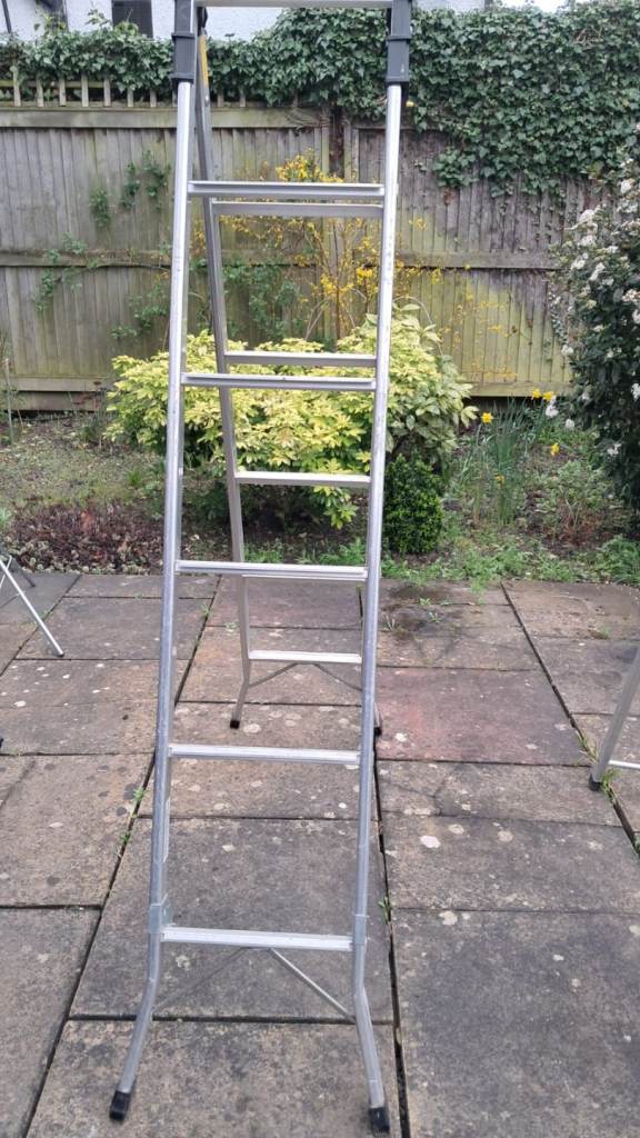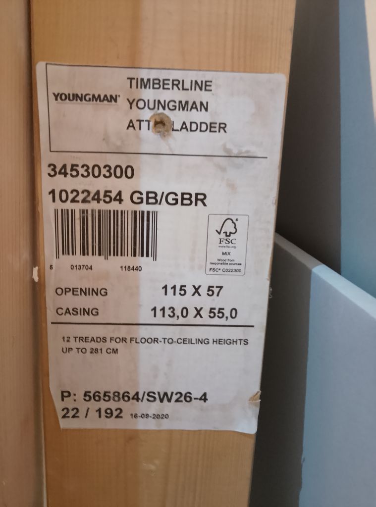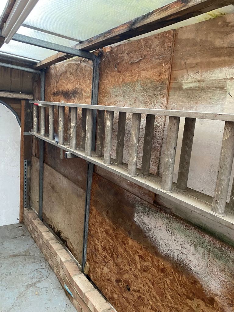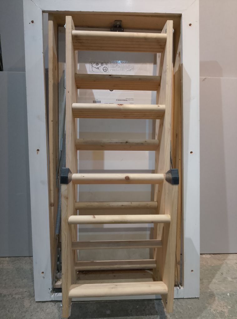Wooden loft ladder, suitable for approx 2.3m. complete with hook to undo and drop and fixing screws. Part of the frame has been cut to fit otherwise good condition.