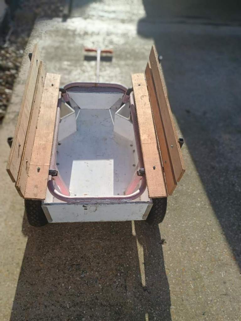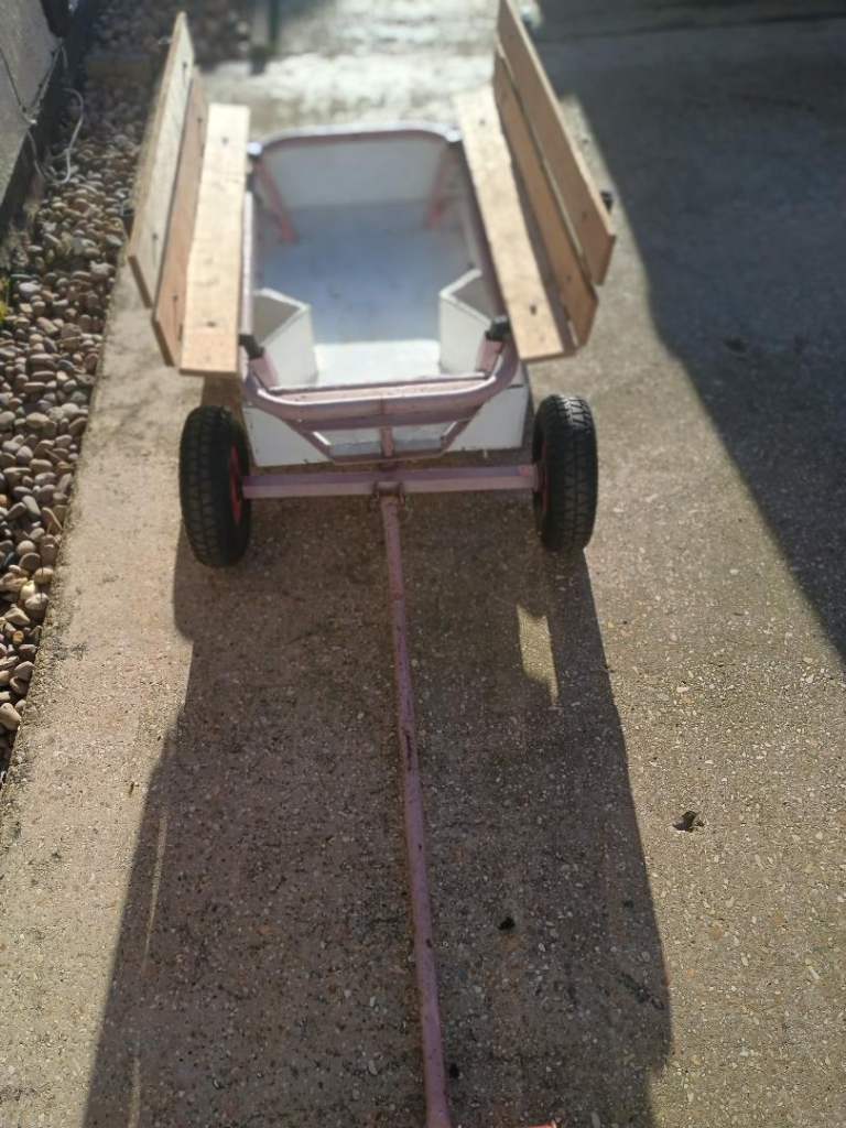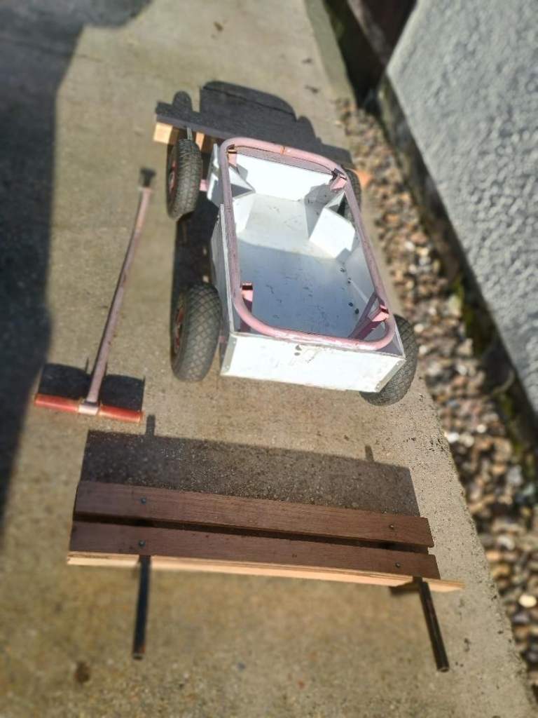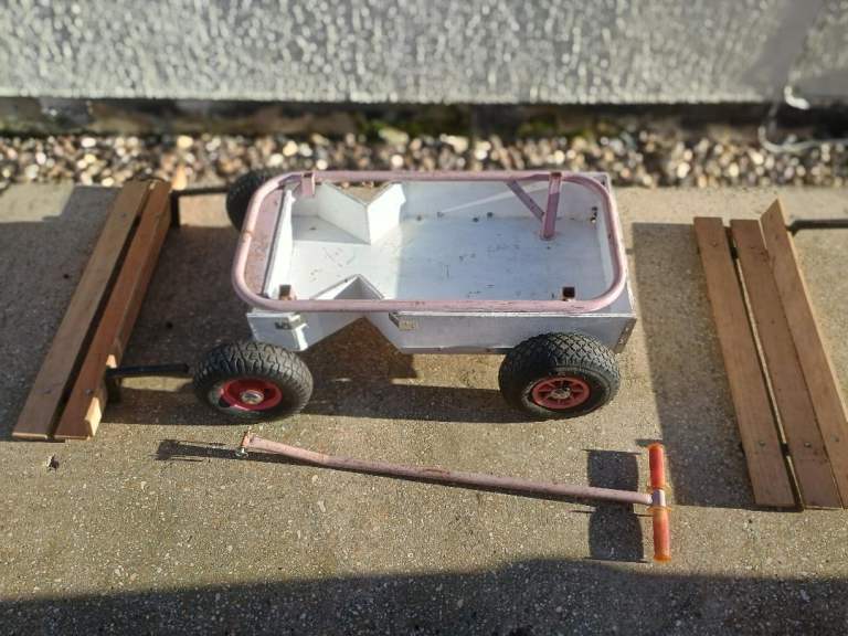 Sturdy hand truck with 10 inch diameter pneumatic tyres . Dimensions :Truck width 24 inches wheel to wheel and 36 inches long , truck body 17 inches wide by 29 inches long , handle is 35 inches long . This truck easily breaks down into 4 parts for ease of storage and transporting , the body is made from 10 mm plywood . Ideal or use at car boot sales, auto jumbles and allotments . Cash on collection only please