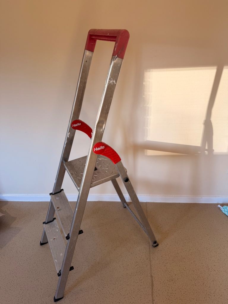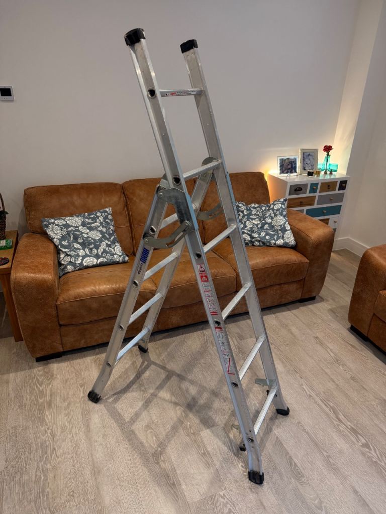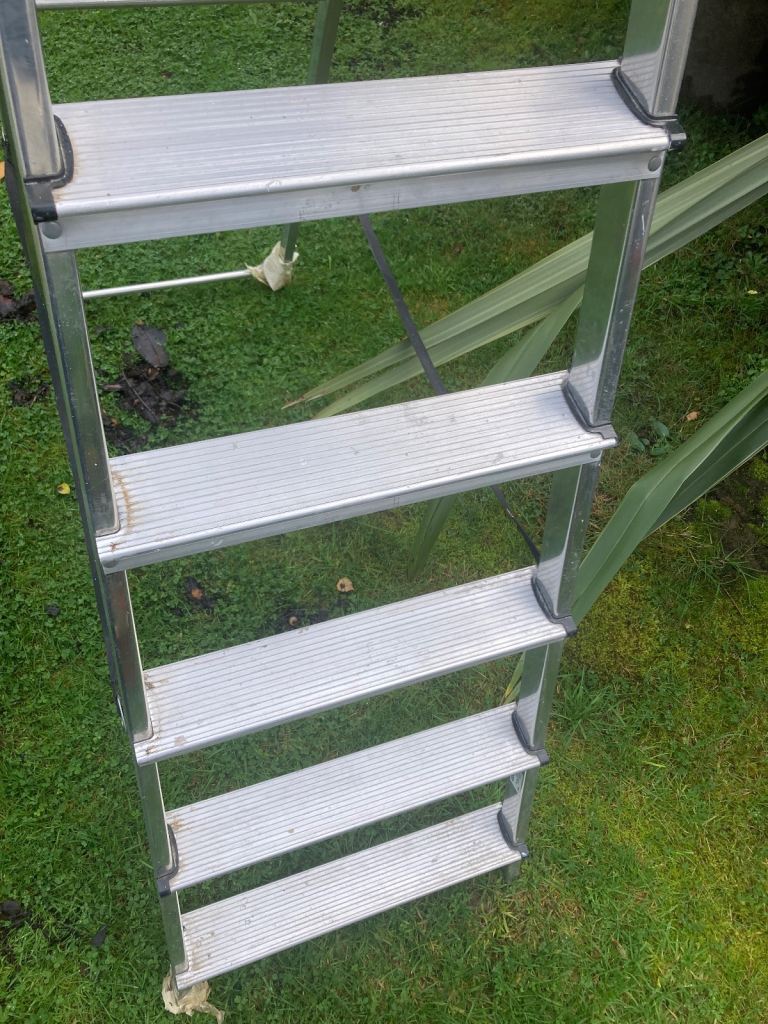 This is a tall aluminium step ladder with platform and railing, the platform is at 150cm and railing at190cm, excellent condition