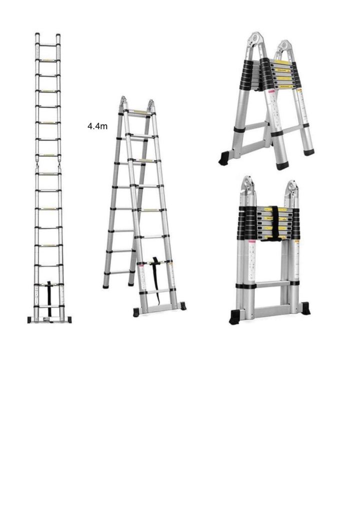 Telescopic Ladder 4.4 m with Stabiliser Bar, Multi-purpose Folding Ladder - A-frame Ladder & Straight Ladder for Indoor Outdoor, Portable Aluminium Ladder EN131, 150 kg Capacity Max Load , 100 per each