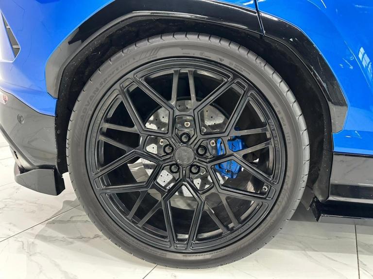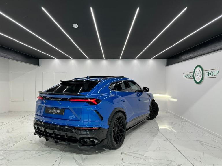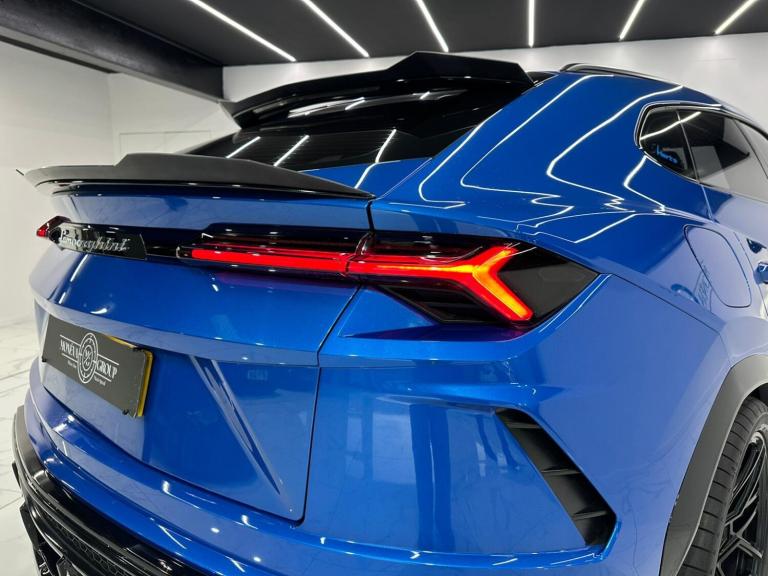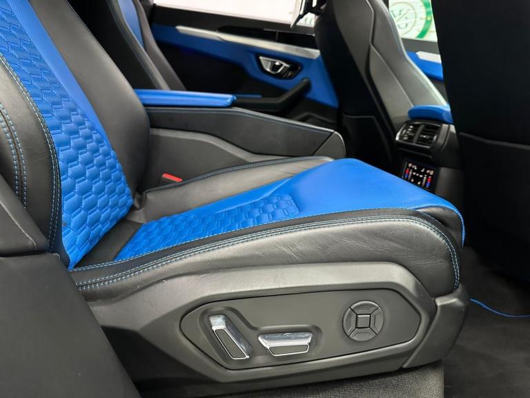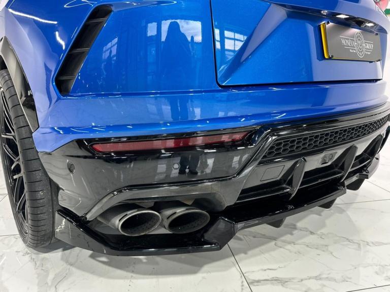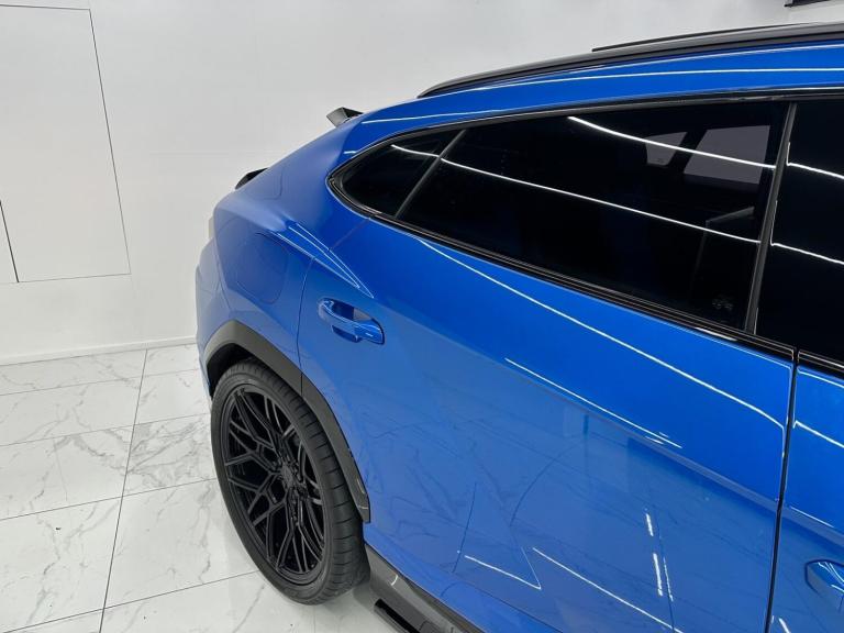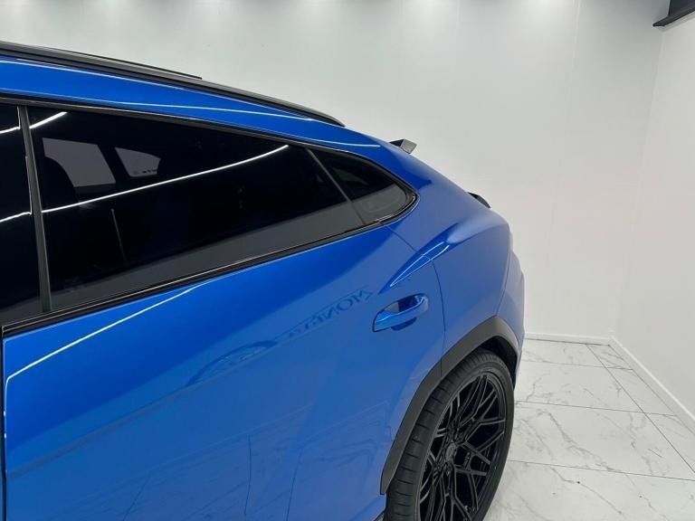 Finished in the stunning Nethuns Metallic Blue, this Lamborghini Urus has covered 84,100 miles and is powered by a 4.0-litre V8 producing 640bhp, paired with an 8-speed automatic transmission. Performance is substantial, with 060mph in 3.5 seconds and a top speed of 190mph, delivering supercar-level pace in a practical SUV format. Exterior -Gloss black styling kit -Gloss black front splitter, side skirts and rear diffuser -Gloss black spoiler lip extensions -23"" gloss black Urban alloy wheels -Blue Lamborghini brake calipers with carbon ceramic disc brakes -Smoked headlights and rear lights -Roof rail bars Interior The interior is finished with a bespoke blue specification, featuring contrast stitching throughout the cabin, steering wheel and seats. Additional highlights include: -Optional 4-seat configuration -Rear touch screens -Fully electric and heated seats -Rear centre console with Lamborghini rear touchscreens -Dual front touchscreens with haptic feedback -Bang & Olufsen sound system -Switchable driver modes and adjustable suspension -Cruise control -Disc drive CD player -Automatic headlights -Alcantara roof lining -Panoramic roof -Ghost immobiliser fitted A well-specified Urus offering strong performance, distinctive styling and a high level of interior comfort, presented in a striking colour and specification.