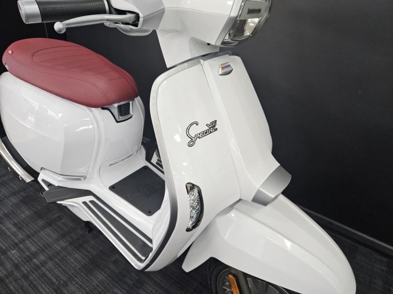 Now Available at Appleyard Motorcycles , The Lambretta V Special 125cc introduces the double-layered side panel. The base is an ingenious 1.2mm steel structure that stretches to the sides in an aeroplane profile architecture. This construction grants Lambretta owners easy access to their engine whilst avoiding unnecessary weight increase. The V Special is available in both fixed and flex mudguards to anticipate the personal taste of its owner. Available in a range of bold colours to suit all tastes, make a statement and make the new Lambretta V Special your next scooter. For fun or commuting, Lambretta has got you covered.