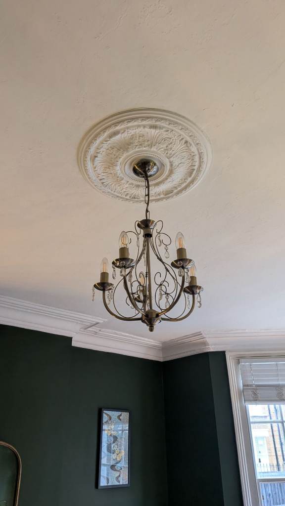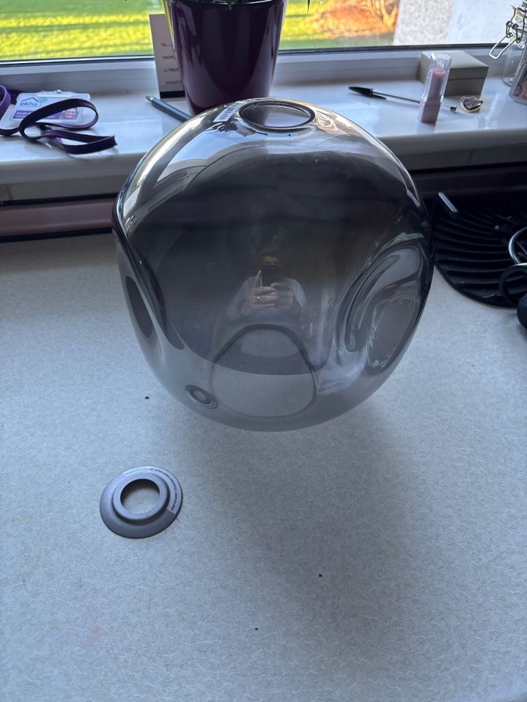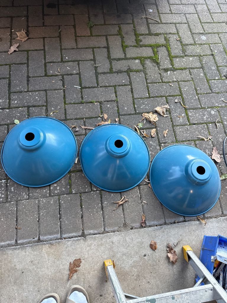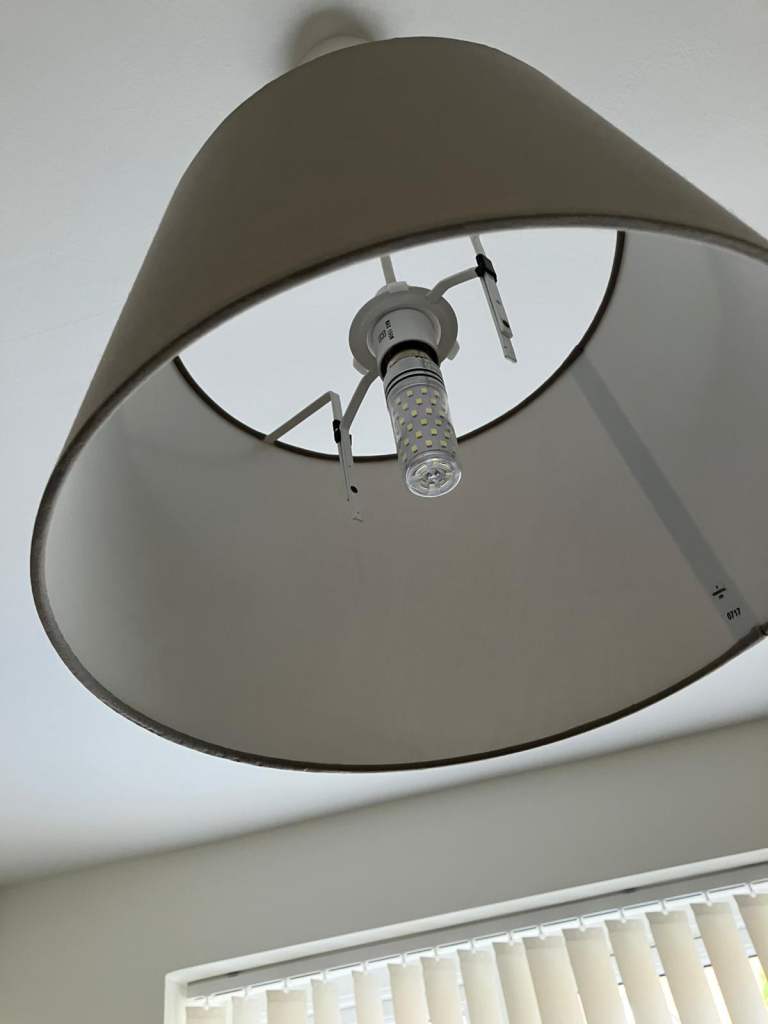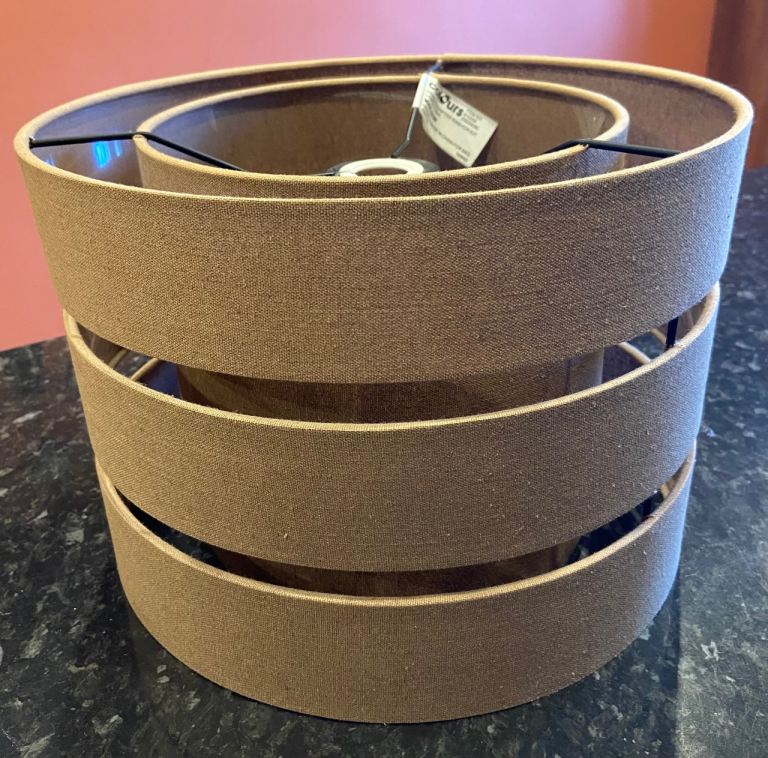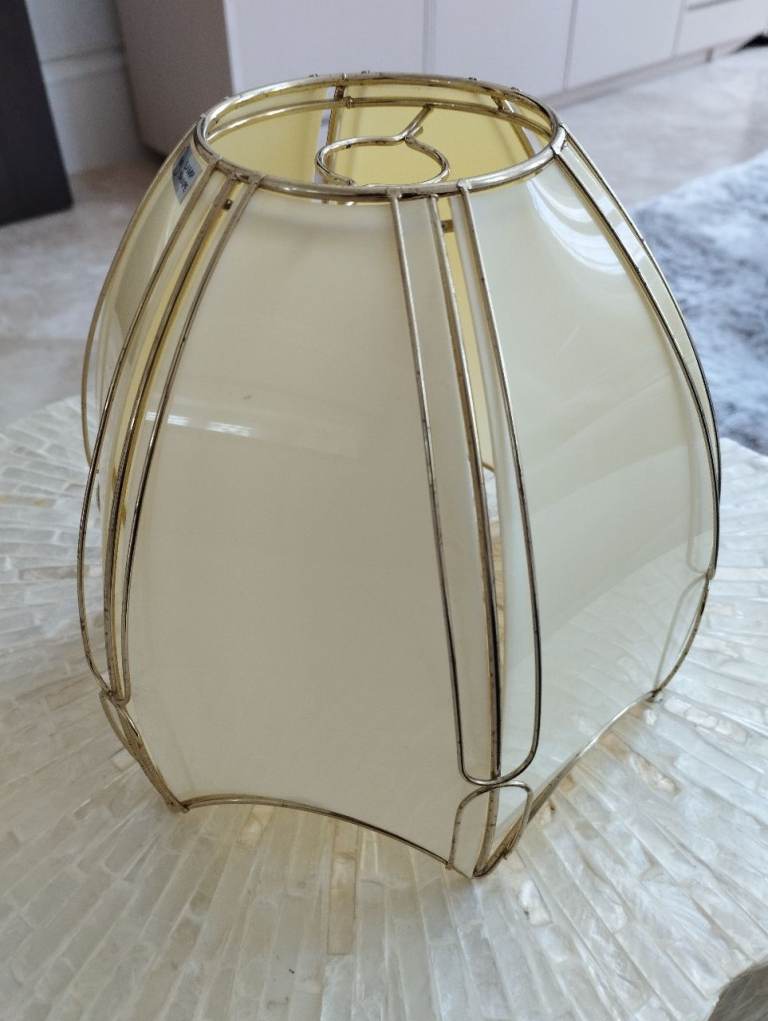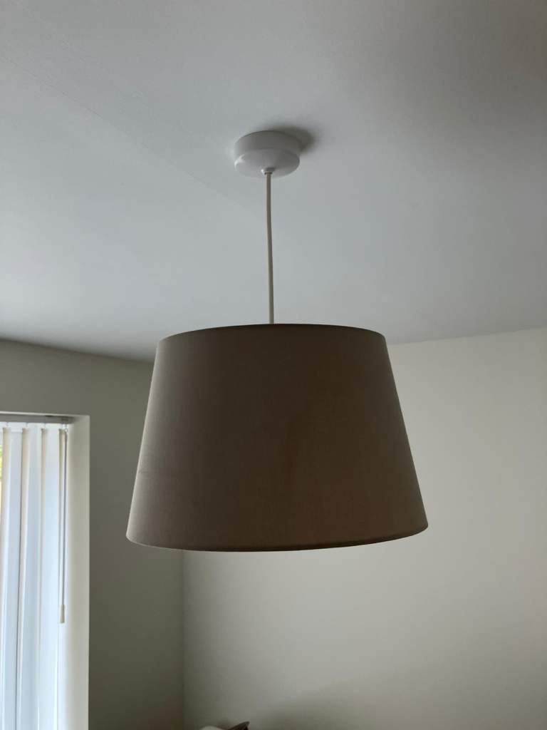 5 matching light shades for sale in a beige / light grey colour. They are tapered in design and measure 27cm wide (top) to 34cm wide (bottom).