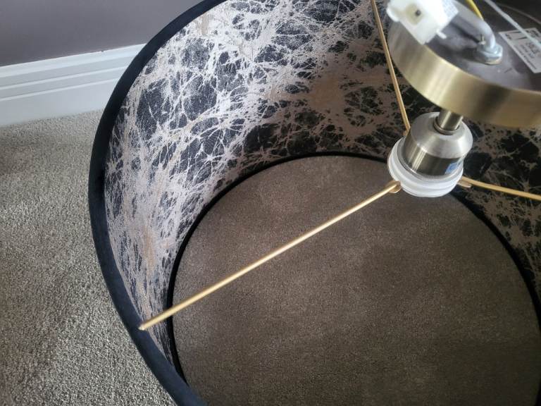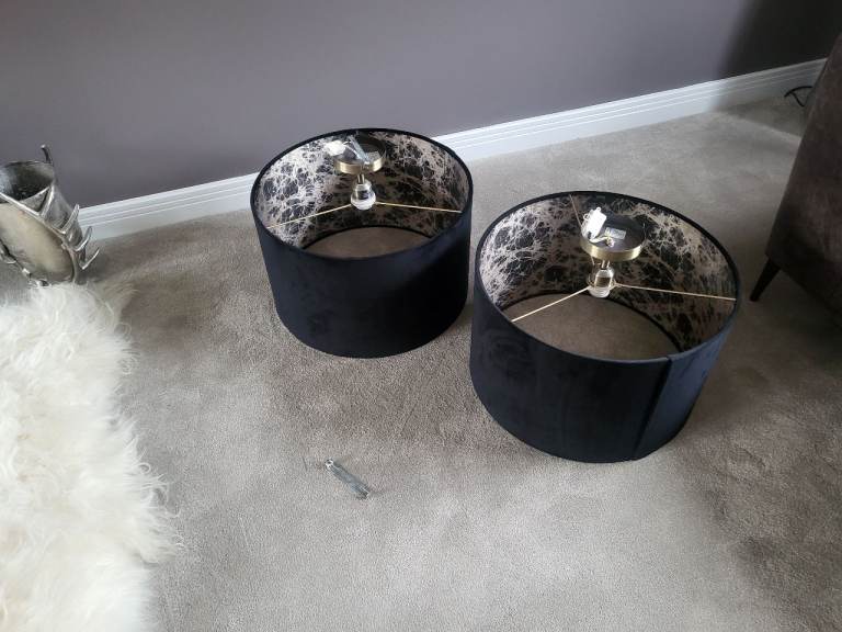 Shades alone are 50cm diam x 30 cm drop, black velvet outer with black and gold inner lining.