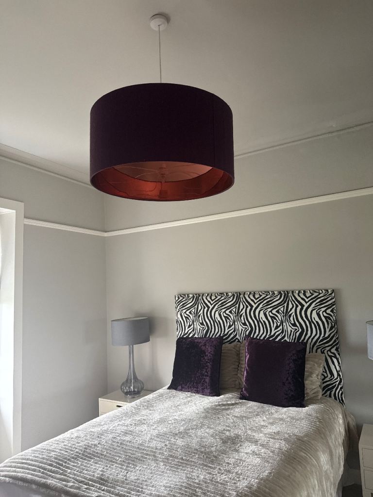 Lovely large drum lampshade in a deep purple fabric with a striking copper coloured interior.