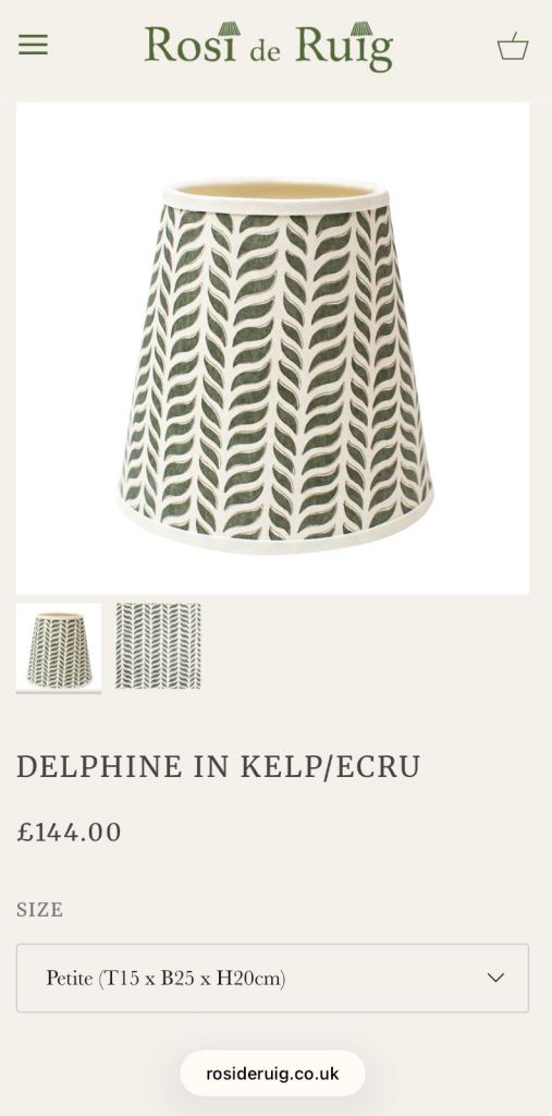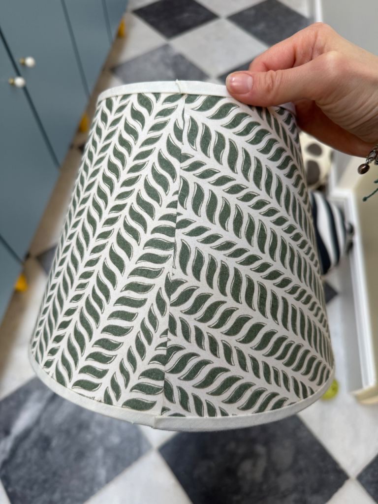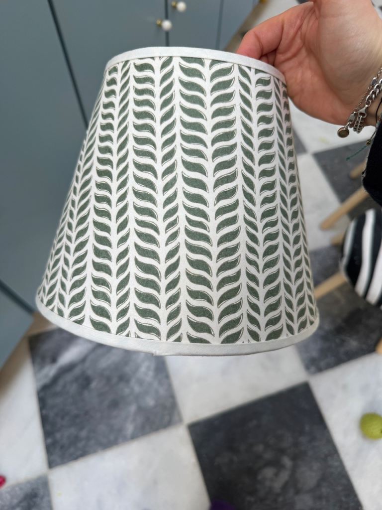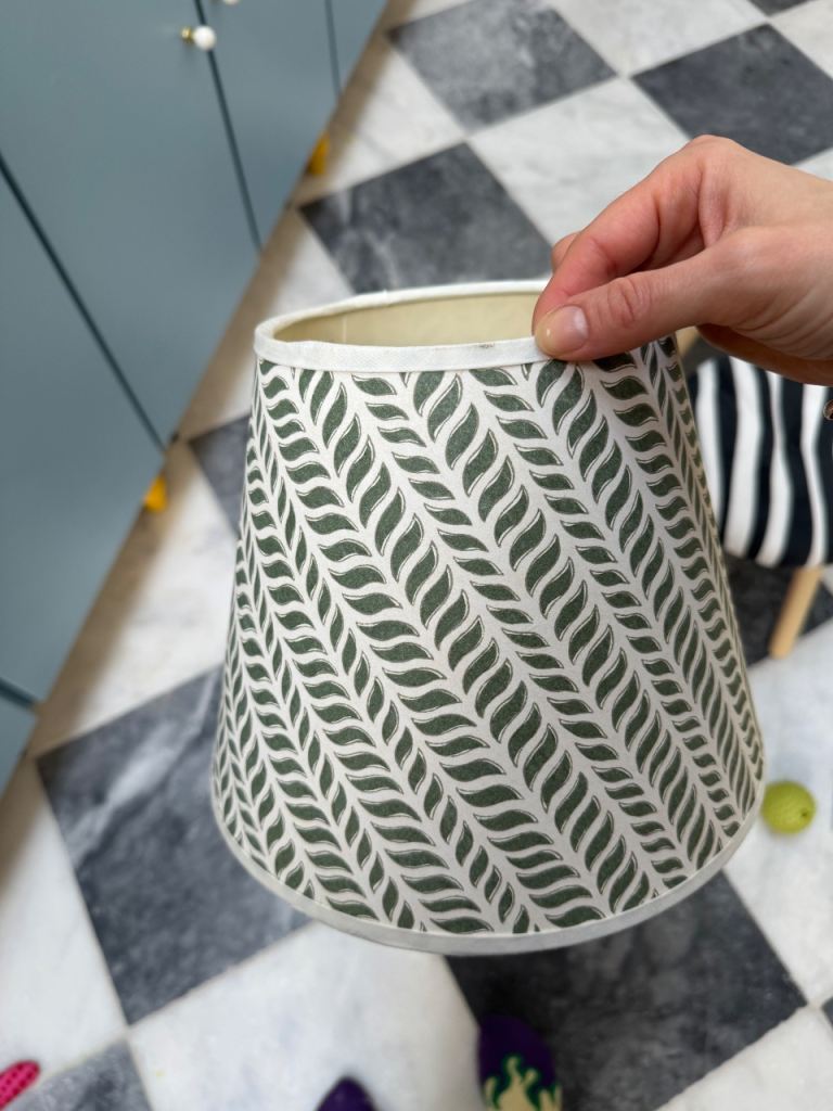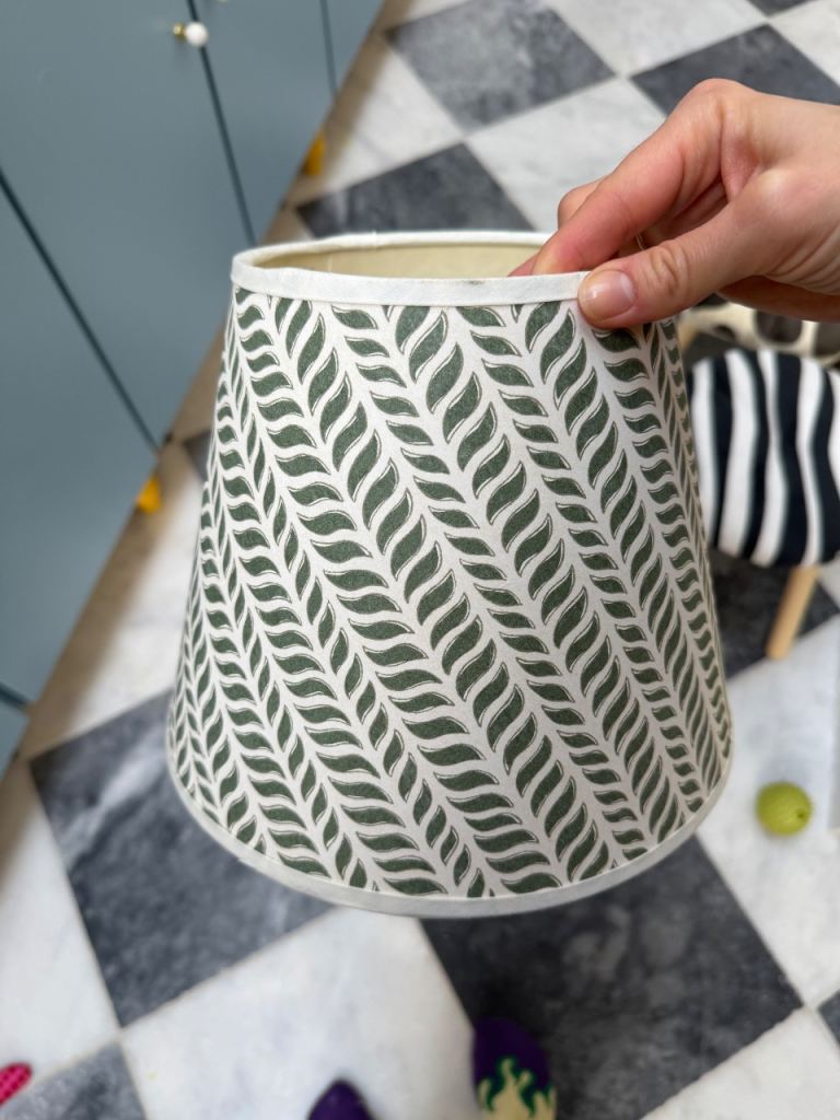 Rosi de Ruig Delphine Petite Lampshade T15 x B25 x H20 with bottom utility fitting. Card is hand printed in a dark green on ecru background. In good condition but does have some light marks - please see pictures. rrp £144