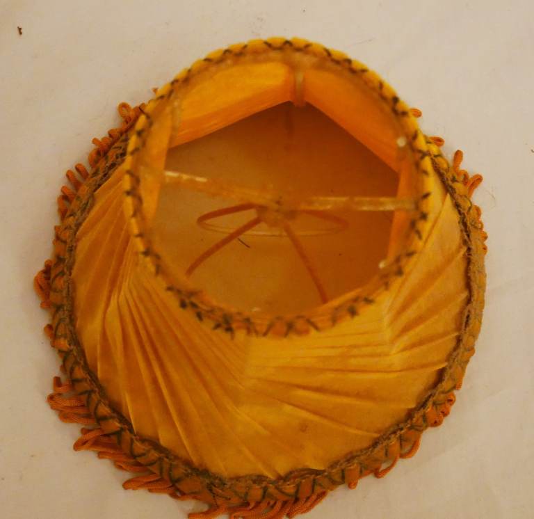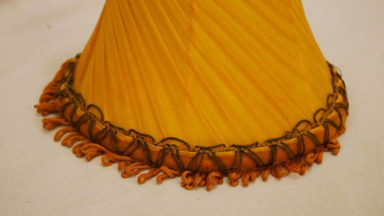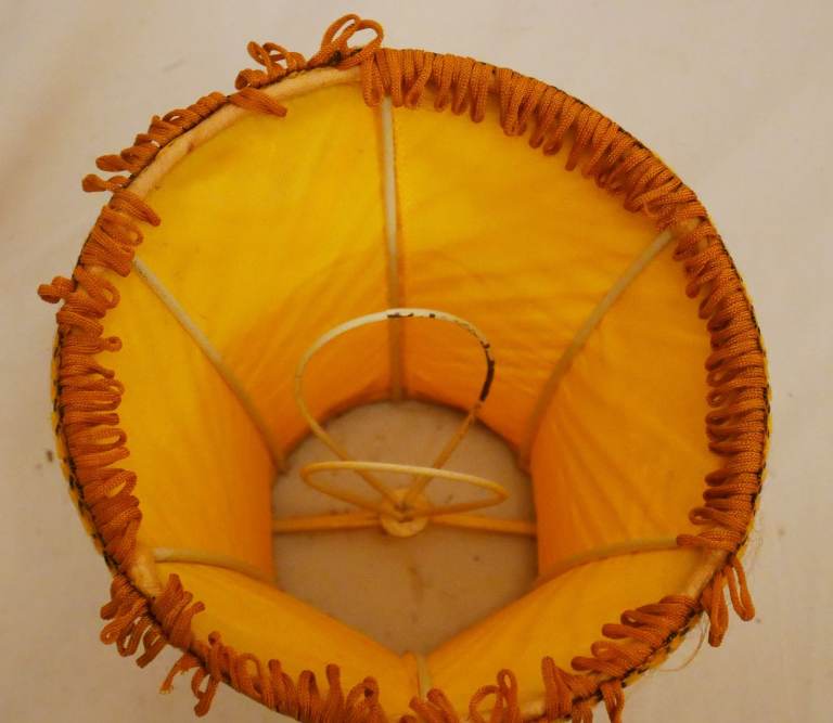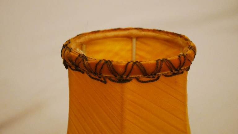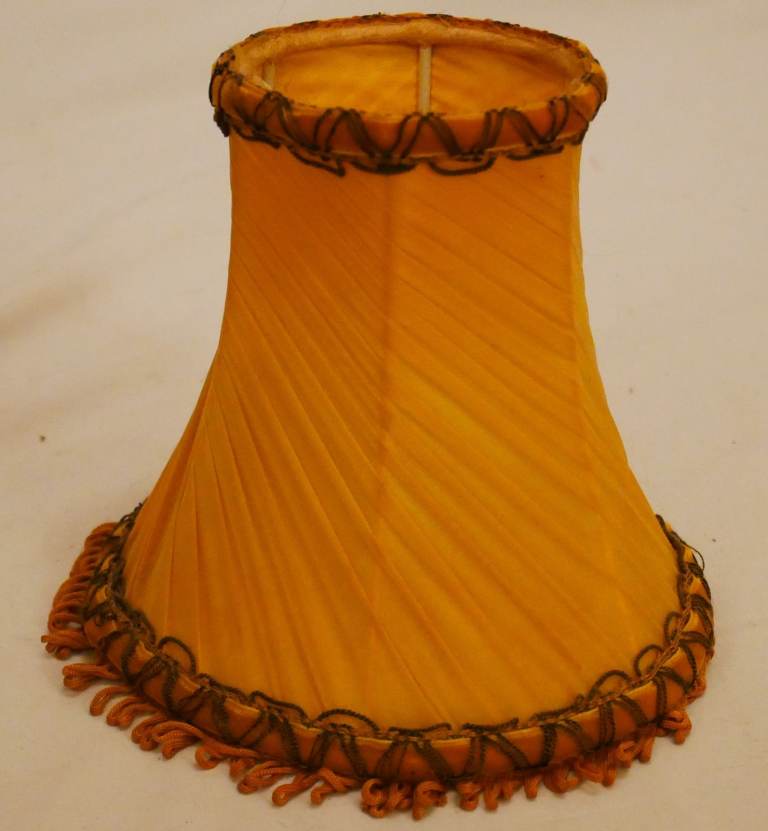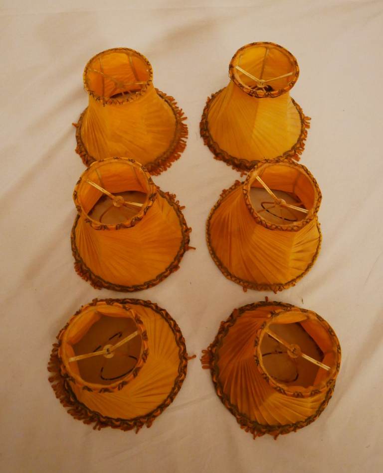 Pre-owned vintage set of 6 small gold fabric lightshades with top and bottom embellishments and small fringe. Good condition for its age – please see photos.