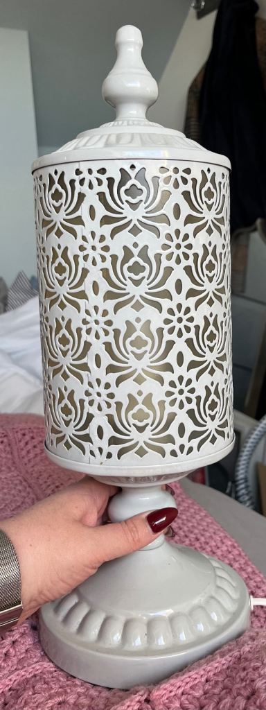 I brought this lamp a few months ago, it was taking ages to be delivered, weeks in fact, so I ordered a different lamp, I just never got the chance to send it back because of problems at the time, it's all boxed I haven't used it, it's been sitting in my hall for weeks, it cost me about £37 on a popular purchasing platform, beginning A finishing with m, the tall part of the lamp is chrome, and the shade is a pale shade of beige, as you can see from the images...