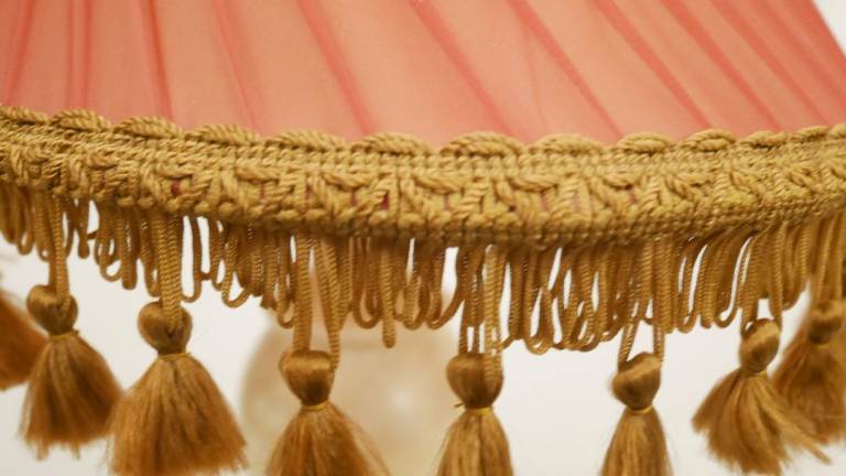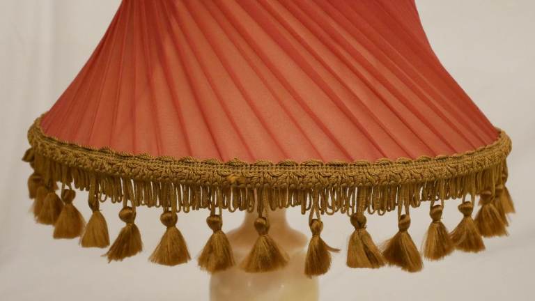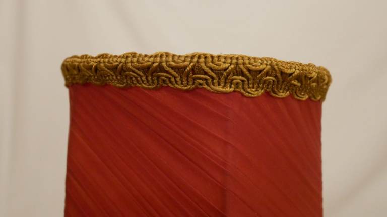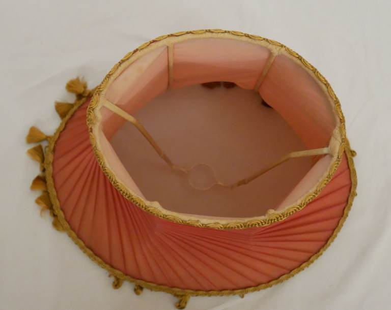 Pre-owned vintage red fabric pleated lightshade with gold fringe and tassels. Good condition for its age – please see photos.