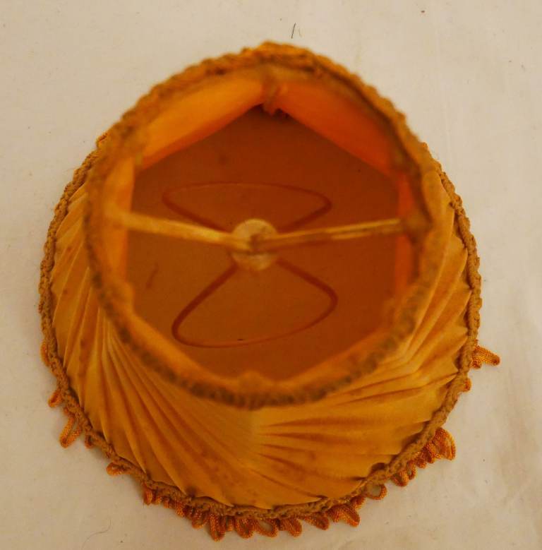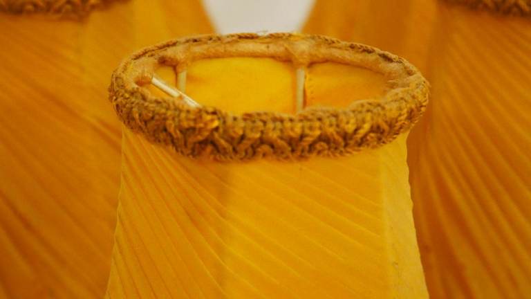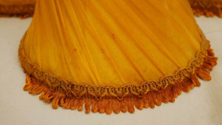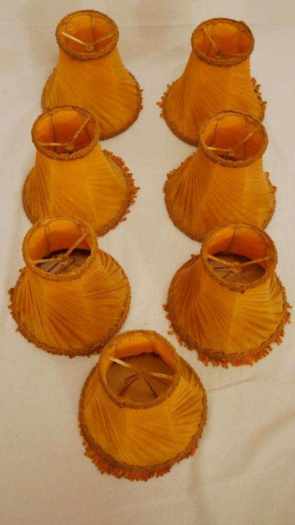 Pre-owned vintage set of 7 small gold fabric lightshades with top and bottom embellishments and small fringe. Good condition for its age – please see photos.